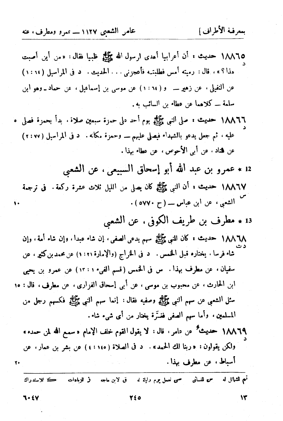 س في الخمس (قسم الفئ 1: 13) عن عمرو بن يحيى بن الحارث، عن محبوب بن موسى، عن أبي إسحاق الفزاري، عن مطرف قال: سئل الشعبي عن سهم النبي صَلَّى اللَّهُ عَلَيْهِ وَسَلَّمَ وصفيه فقال: إنما سهم النبي صَلَّى اللَّهُ عَلَيْهِ وَسَلَّمَ فكسهم رجل من المسلمين، وأما سهم الصفي فغرة يختار من أي شيء شاء.