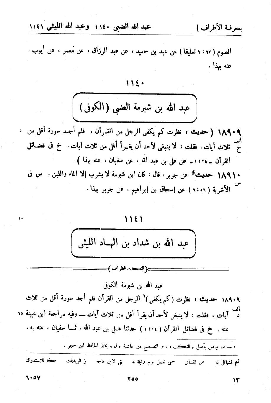 18909 - (ألف خ) (حديث: نظرت كم يكفي الرجل من القرآن، فلم أجد سورة أقل من ثلاث آيات، فقلت: لا ينبغي لأحد أن يقرأ أقل من ثلاث آيات. (خ) في فضائل القرآن (34: 1) عن علي بن عبد الله، عن سفيان، عنه بهذا) .