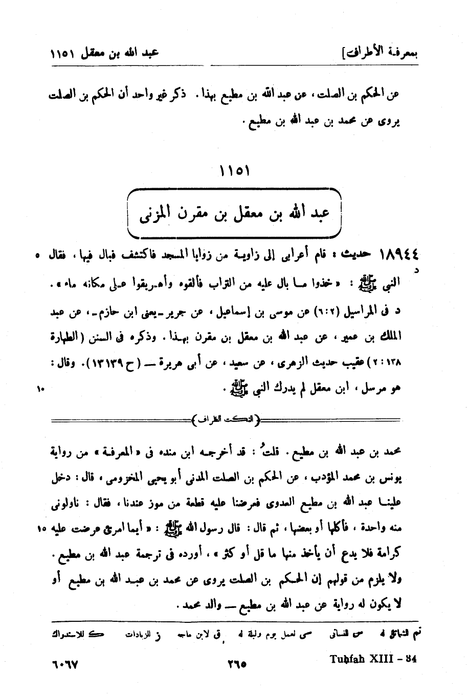 18944 -[د] حديث: قام أعرابي إلى زاوية من زوايا المسجد فاكتشف فبال فيها، فقال النبي صَلَّى اللَّهُ عَلَيْهِ وَسَلَّمَ: خذوا ما بال عليه من التراب فألقوه وأهريقوا على مكانه ماء. (د) في المراسيل (2: 6) عن موسى بن إسماعيل، عن جرير - يعني ابن حازم -، عن عبد الملك بن عمير، عن عبد الله بن معقل بن مقرن بهذا. وذكره في السنن (الطهارة 138: 2) عقيب حديث الزهري، عن سعيد، عن أبي هريرة - (ح 13139) . وقال: هو مرسل، ابن معقل لم يدرك النبي صَلَّى اللَّهُ عَلَيْهِ وَسَلَّمَ.