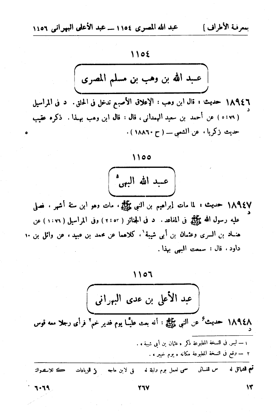 18947 -[د] حديث: لما مات إبراهيم بن النبي صَلَّى اللَّهُ عَلَيْهِ وَسَلَّمَ، مات وهو ابن ستة أشهر، فصلى عليه رسول الله صَلَّى اللَّهُ عَلَيْهِ وَسَلَّمَ في المقاعد. (د) في الجنائز (53: 2) وفي المراسيل (76: 1) عن هناد بن السري وعثمان بن أبي شيبة1، كلاهما عن محمد بن عبيد، عن وائل بن داود، قال: سمعت البهي بهذا.