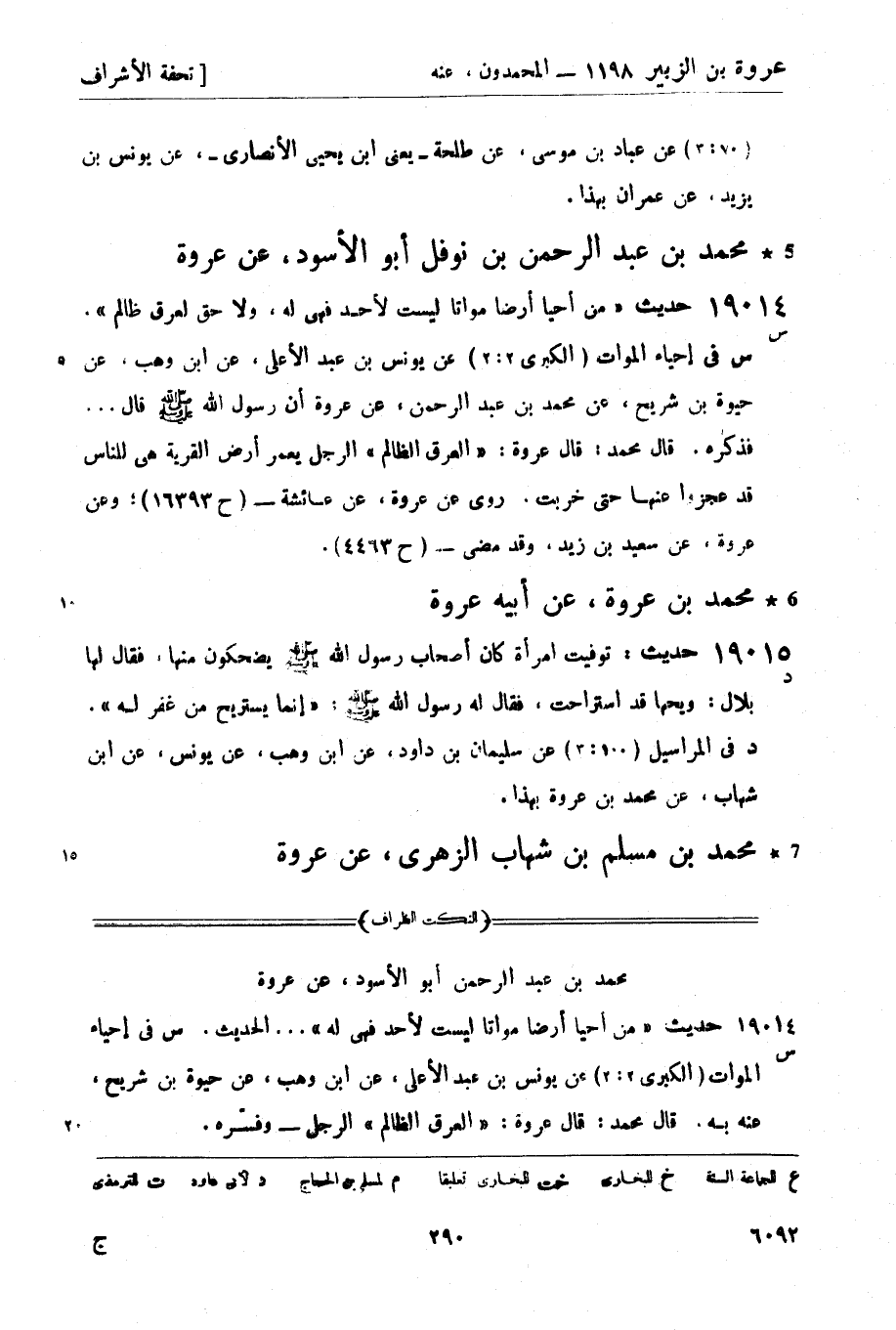 19014 -[س] حديث من أحيا أرضا مواتا ليست لأحد فهي له، ولا حق لعرق ظالم. (س) في أحياء الموات (الكبرى 2: 2) عن يونس بن عبد الأعلى، عن ابن وهب، عن حيوه بن شريح، عن محمد بن عبد الرحمن، عن عروة أن رسول الله صَلَّى اللَّهُ عَلَيْهِ وَسَلَّمَ قال ... فذكره. قال محمد: قال عروة: العرق الظالم الرجل يعمر أرض القرية هي للناس قد عجزوا عنها حتى خربت. روى عن عروة، عن عائشة - (ح 16393) ، وعن عروة، عن سعيد بن زيد، وقد مضى - (ح 4463) .