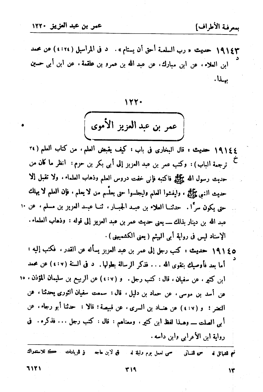 19144 - حديث: قال البخاري في باب: كيف يقبض العلم، من كتاب العلم (34 ترجمة الباب) : وكتب عمر بن عبد العزيز إلى أبي بكر بن حزم: انظر ما كان من حديث رسول الله صَلَّى اللَّهُ عَلَيْهِ وَسَلَّمَ فاكتبه فإني خفت دروس العلم وذهاب العلماء، ولا تقبل إلا حديث النبي صَلَّى اللَّهُ عَلَيْهِ وَسَلَّمَ، وليفشوا العلم وليجلسوا حتى يعلم من لا يعلم، فإن العلم لا يهلك حتى يكون سرا. حدثنا العلاء بن عبد الجبار، ثنا عبد العزيز بن مسلم، عن عبد الله بن دينار بذلك - يعني حديث عمر بن عبد العزيز إلى قوله: وذهاب العلماء. الإسناد ليس في رواية أبي الهيثم (يعني الكشميهني) .
