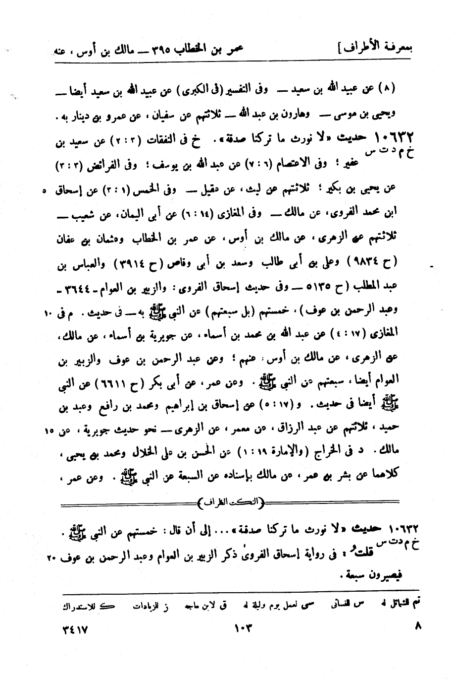10632 -[خ م د ت س] حديث لا نورث ما تركنا صدقة. خ في النفقات (3: 2) عن سعيد بن عفير؛ وفي الاعتصام (6: 7) عن عبد الله بن يوسف؛ وفي الفرائض (3: 3) عن يحيى بن بكير؛ ثلاثتهم عن ليث، عن عقيل - وفي الخمس (1: 3) عن إسحاق بن محمد الفروي، عن مالك - وفي المغازي (14: 6) عن أبي اليمان، عن شعيب - ثلاثتهم عن الزهري، عن مالك بن أوس، عن عمر بن الخطاب وعثمان بن عفان (ح 9834) وعلي بن أبي طالب وسعد بن أبي وقاص (ح 3914) والعباس بن عبد المطلب (ح 5135 - وفي حديث إسحاق الفروي: والزبير بن العوام - 3644 - وعبد الرحمن بن عوف) ، خمستهم (بل سبعتهم) عن النبيّ صَلَّى اللَّهُ عَلَيْهِ وَسَلَّمَ به. في حديث. م في المغازي (17: 4) عن عبد الله بن محمد بن أسماء، عن جويرية بن أسماء، عن مالك، عن الزهري، عن مالك بن أوس، عنهم؛ وعن عبد الرحمن بن عوف والزبير بن العوام أيضاً، سبعتهم عن النبيّ صَلَّى اللَّهُ عَلَيْهِ وَسَلَّمَ. وعن عمر، عن أبي بكر (ح 6611) عن النبيّ صَلَّى اللَّهُ عَلَيْهِ وَسَلَّمَ أيضاً في حديث. و (17: 5) عن إسحاق بن إبراهيم ومحمد بن رافع وعبد بن حميد، ثلاثتهم عن عبد الرزاق، عن معمر، عن الزهري - نحو حديث جويرية، عن مالك. د في الخراج (والإمارة 19: 1) عن الحسن بن علي الخلال ومحمد بن يحيى، كلاهما عن بشر بن عمر، عن مالك بإسناده عن السبعة عن النبيّ صَلَّى اللَّهُ عَلَيْهِ وَسَلَّمَ. وعن عمر، -[104]- عن أبي بكر عن النبيّ صَلَّى اللَّهُ عَلَيْهِ وَسَلَّمَ به - في حديث. و (19: 2) عن محمد بن عبيد، عن محمد بن ثور، عن معمر، عن الزهري كذلك. ت في السير (44: 3) عن الحسن بن علي الخلال بإسناده نحوه. وقال: حسن صحيح غريب من حديث مالك. س في الفرائض (الكبرى 2: 4) عن عمرو بن علي، عن بشر بن عمر بإسناده مثله. و (2: 3) عن محمد بن منصور، عن سفيان، عن عمرو بن دينار، عن الزهري، عن مالك بن أوس، عن عمر وعثمان وطلحة (ح 5008) والزبير وسعد وعبد الرحمن بن عوف، ستتهم عن النبيّ صَلَّى اللَّهُ عَلَيْهِ وَسَلَّمَ به. و (2: 1) عن هلال بن العلاء، عن محمد بن حاتم، عن ابن المبارك، عن معمر ويونس، كلاهما عن الزهري، عن مالك بن أوس، عن عمر وعلي وطلحة وسعد وعبد الرحمن، خمستهم عن النبيّ صَلَّى اللَّهُ عَلَيْهِ وَسَلَّمَ به. و (2: 2) عن أحمد بن سليمان، عن يحيى بن آدم، عن سفيان بن عيينة، عن معمر وعمرو بن دينار، كلاهما عن الزهري، عن مالك بن أوس، عن عمر عن النبيّ صَلَّى اللَّهُ عَلَيْهِ وَسَلَّمَ.