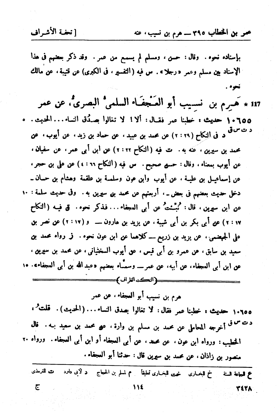 10655 -[د ت س ق] حديث: خطبنا عمر فقال: ألا! لا تغالوا بصدُق النساء ... الحديث. د في النكاح (29: 2) عن محمد بن عبيد، عن حماد بن زيد، عن أيوب، عن محمد بن سيرين , عنه به. ت فيه (النكاح 22: 2) عن ابن أبي عمر، عن سفيان، عن أيوب بمعناه، وقال: حسن صحيح. س فيه (النكاح 66: 4) عن علي بن حجر، عن إسماعيل ابن علية، عن أيوب وابن عون وسلمة بن علقمة وهشام بن حسان - دخل حديث بعضهم في بعض -، أربعتهم عن محمد بن سيرين به. وفي حديث سلمة: عن ابن سيرين قال: نُبِّئتُ عن أبي العجفاء ... فذكر نحوه. ق فيه (النكاح 17: 2) عن أبي بكر بن أبي شيبة، عن يزيد بن هارون - و (17: 2) عن نصر بن علي الجهضمي، عن يزيد بن زريع - كلاهما عن ابن عون نحوه. ز رواه محمد بن سعيد بن سابق، عن عمرو بن أبي قيس، عن أيوب السختياني، عن محمد بن سيرين، عن ابن أبي العجفاء، عن أبيه، عن عمر - وسمَّاه بعضهم عبد الله بن أبي العجفاء.