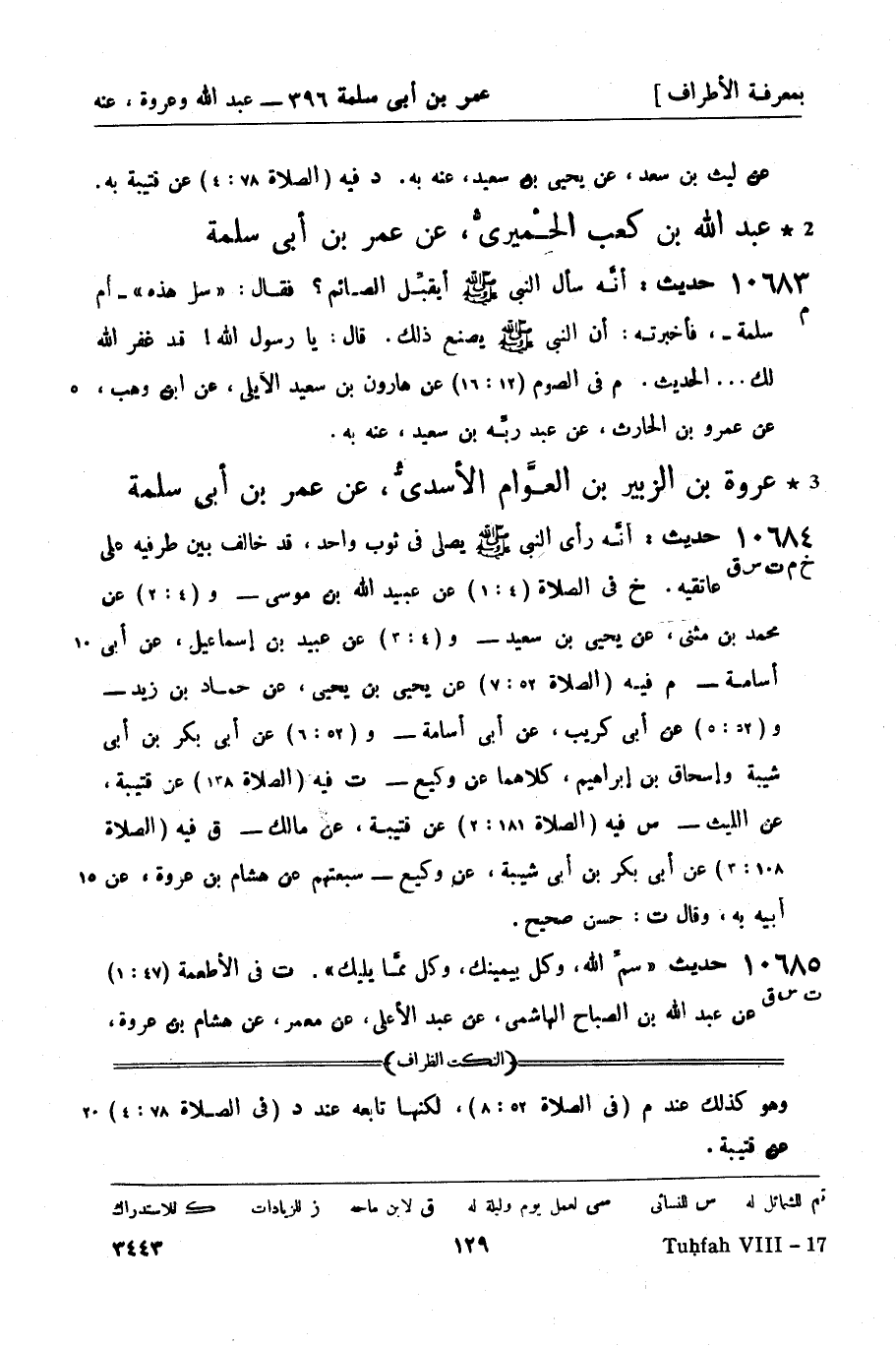10684 -[خ م ت س ق] حديث: أنَّه رأى النبيّ صَلَّى اللَّهُ عَلَيْهِ وَسَلَّمَ يصلي في ثوب واحد، قد خالف بين طرفيه على عاتقيه. خ في الصلاة (4: 1) عن عبيد الله بن موسى - و (4: 2) عن محمد بن مثنى، عن يحيى بن سعيد - و (4: 3) عن عبيد بن إسماعيل، عن أبي أسامة - م فيه (الصلاة 52: 7) عن يحيى بن يحيى، عن حماد بن زيد - و (52: 5) عن أبي كريب، عن أبي أسامة - و (52: 6) عن أبي بكر بن أبي شيبة وإسحاق بن إبراهيم، كلاهما عن وكيع - ت فيه (الصلاة 138) عن قتيبة، عن الليث - س فيه (الصلاة 181: 2) عن قتيبة، عن مالك - ق فيه (الصلاة 108: 3) عن أبي بكر بن أبي شيبة، عن وكيع - سبعتهم عن هشام بن عروة، عن أبيه به. وقال ت: حسن صحيح.