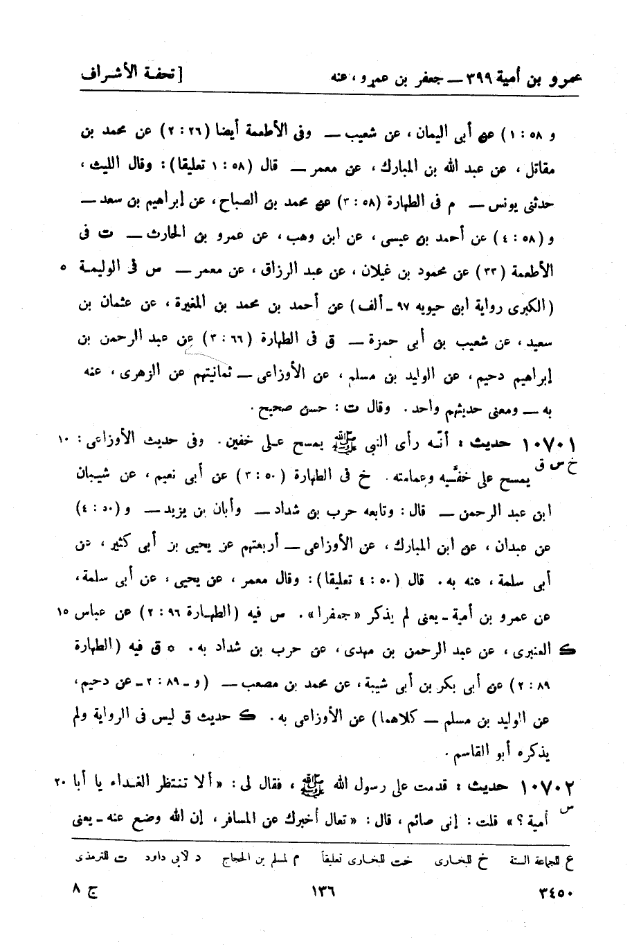 10701 -[خ س ق] حديث: أنّه رأى النبيّ صَلَّى اللَّهُ عَلَيْهِ وَسَلَّمَ يمسح على خفين. وفي حديث الأوزاعي: يمسح على خفَّيه وعمامته. خ في الطهارة (50: 3) عن أبي نعيم، عن شيبان بن عبد الرحمن - قال: وتابعه حرب بن شداد - وأبان بن يزيد - و (50: 4) عن عبدان، عن ابن المبارك، عن الأوزاعي - أربعتهم عن يحيى بن أبي كثير، عن أبي سلمة , عنه به. قال (50: 4 تعليقاً) : وقال معمر، عن يحيى، عن أبي سلمة، عن عمرو بن أمية - يعني لم يذكر جعفراً. س فيه (الطهارة 96: 2) عن عباس العنبري، عن عبد الرحمن بن مهدي، عن حرب بن شداد به. (ك) ق فيه (الطهارة 89: 2) عن أبي بكر بن أبي شيبة، عن محمد بن مصعب - (و- 89: 2 - عن دحيم، عن الوليد بن مسلم - كلاهما) عن الأوزاعي به. ك حديث ق ليس في الرواية ولم يذكره أبو القاسم.