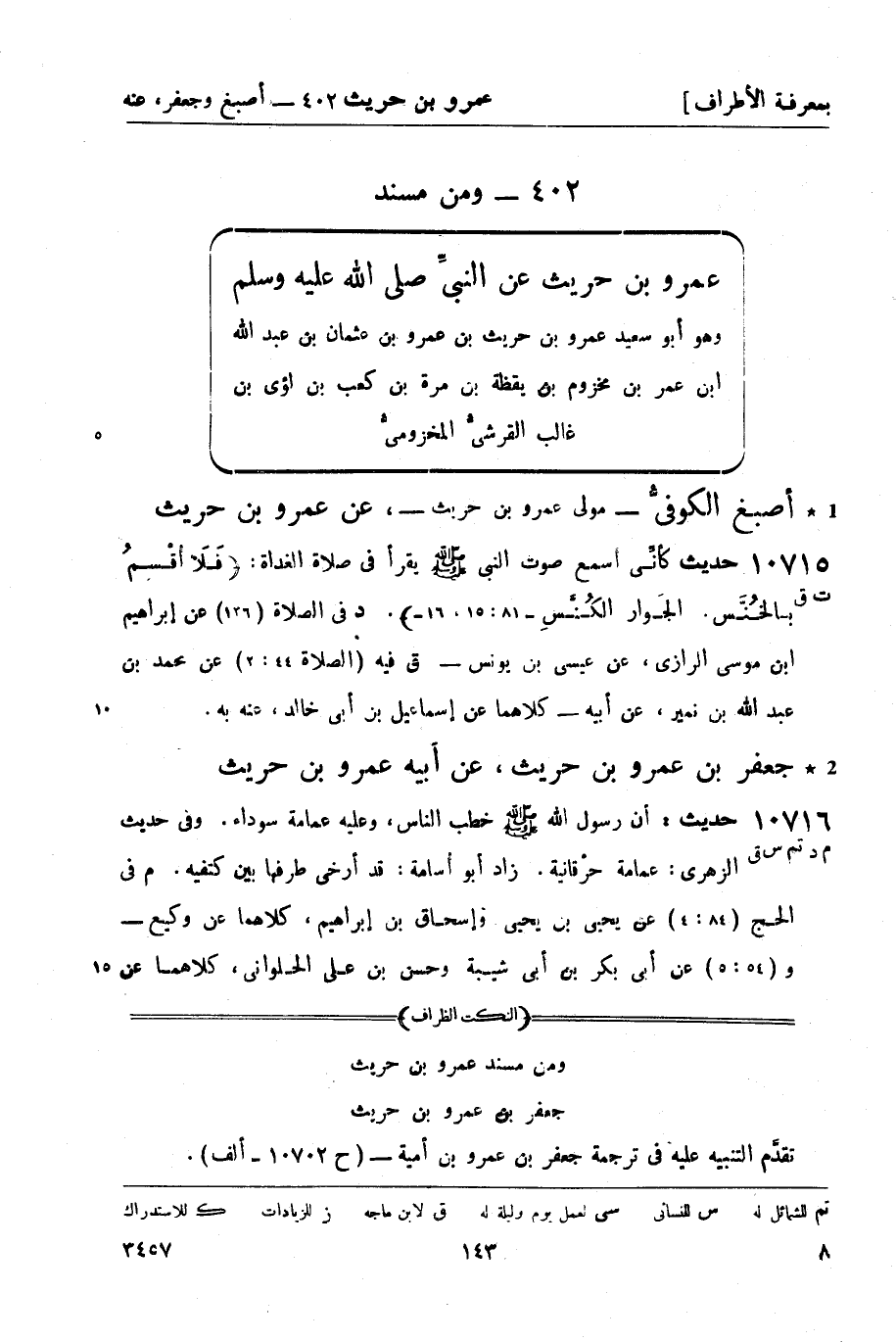 10716 - (م د تم س ق) حديث: أن رسول الله صَلَّى اللَّهُ عَلَيْهِ وَسَلَّمَ خطب الناس، وعليه عمامة سوداء. وفي حديث الزهري: عمامة حرْقانية. زاد أبو أُسامة: قد أرخى طرفها بين كتفيه. م في الحج (84: 4) عن يحيى بن يحيى وإسحاق بن إبراهيم، كلاهما عن وكيع - و (54: 5) عن أبي بكر بن أبي شيبة وحسن بن علي الحلواني، كلاهما عن -[144]- أبي أُسامة - كلاهما عن مساور الورّاق , عنه به. د في اللباس (23: 2) عن الحلواني به. ت في الشمائل (17: 3) عن محمود بن غيلان ويوسف بن عيسى، كلاهما عن وكيع به. و (17: 2) عن ابن أبي عمر، عن سفيان، عن مساور الورّاق به. س في الزينة (108) عن محمد بن أبان، عن أبي أسامة به. و (106) عن عبد الله بن محمد بن عبد الرحمن الزهري، عن سفيان به. ق في اللباس (14: 1) [والجمعة (الصلاة 124: 2) ] ، عن هشام بن عمار، عن سفيان به. وفيه (اللباس 15) وفي الجهاد (22: 1) عن أبي بكر بن أبي شيبة به.