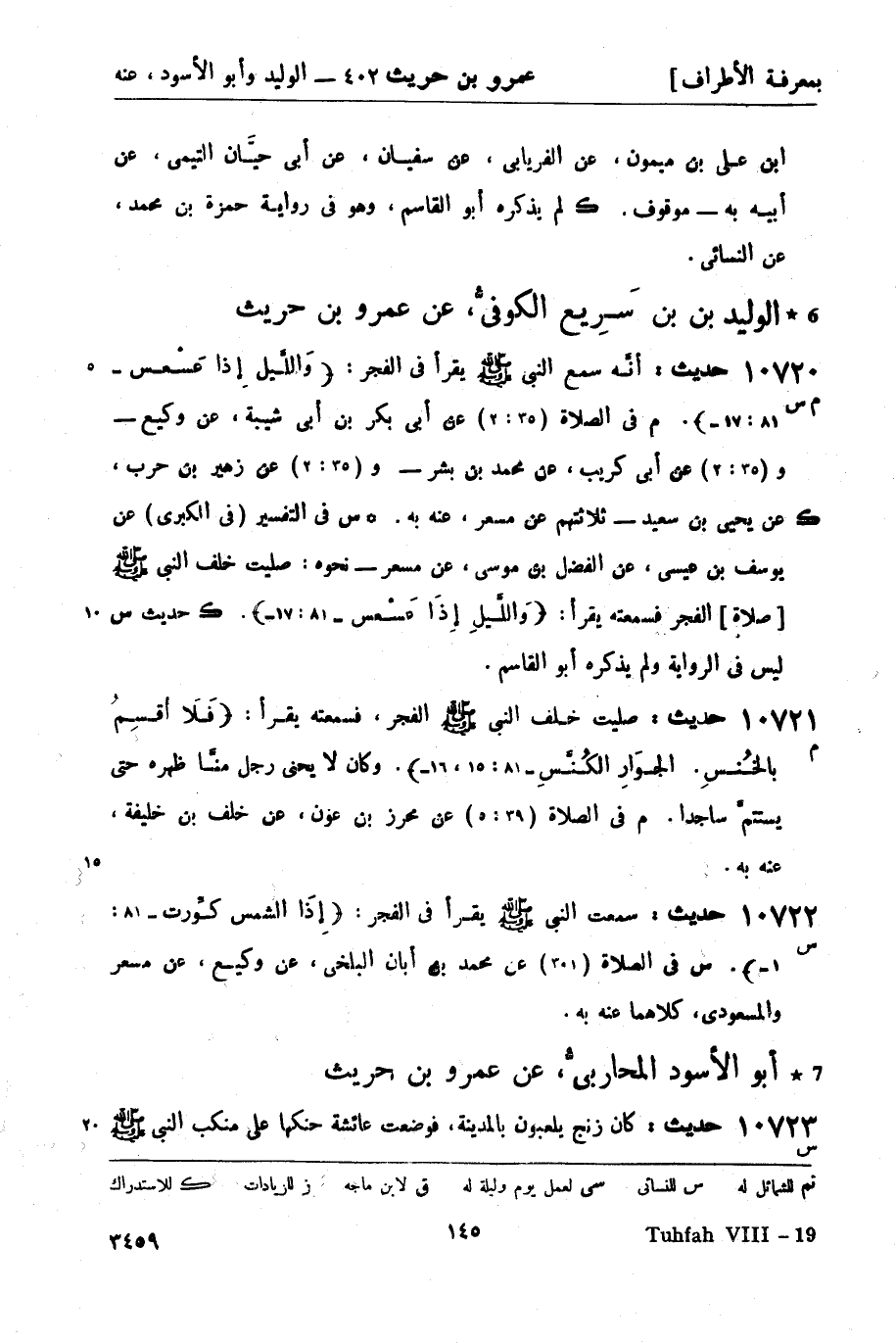 10720 -[م س] حديث: أنَّه سمع النبيّ صَلَّى اللَّهُ عَلَيْهِ وَسَلَّمَ يقرأ في الفجر وَاللَّيلِ إذا عَسْعس (81: 17) . م في الصلاة (35: 2) عن أبي بكر بن أبي شيبة، عن وكيع - و (35: 2) عن أبي كريب، عن محمد بن بشر - و (35: 2) عن زهير بن حرب، عن يحيى بن سعيد - ثلاثتهم عن مسعر , عنه به. (ك) س في التفسير (في الكبرى) عن يوسف بن عيسى، عن الفضل بن موسى، عن مسعر - نحوه: صليت خلف النبيّ صَلَّى اللَّهُ عَلَيْهِ وَسَلَّمَ [صلاة] الفجر فسمعته يقرأ: وَاللَّيلِ إِذَا عَسْعس (1 - 18: 17) . ك حديث س ليس في الرواية ولم يذكره أبو القاسم.