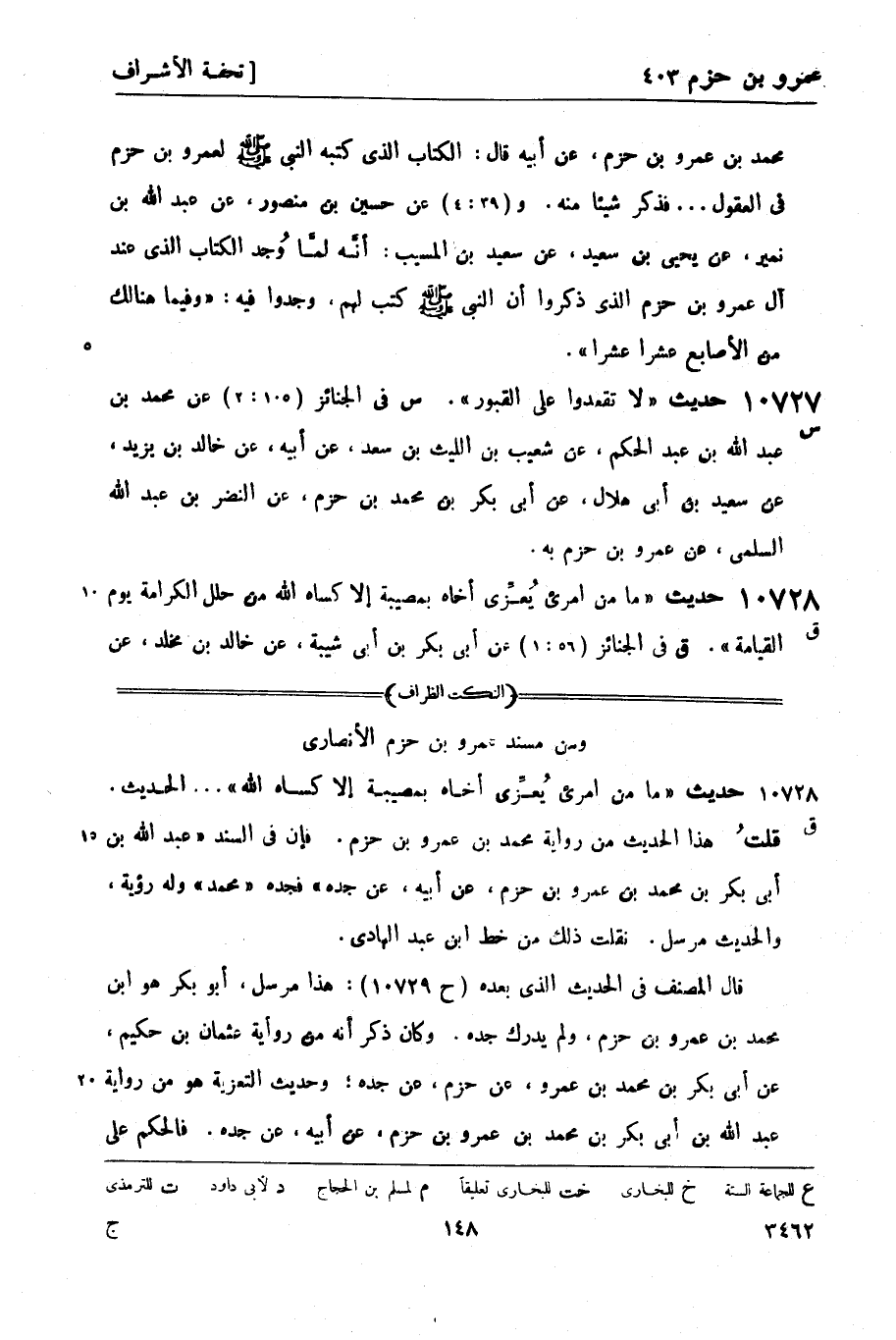 10728 -[ق] حديث ما من امرئ يُعزِّي أخاه بمصيبة إلا كساه الله من حلل الكرامة يوم القيامة. ق في الجنائز (56: 1) عن أبي بكر بن أبي شيبة، عن خالد بن مخلد، عن -[149]- قيس بن أبي عمارة - مولى الأنصار - قال: سمعت عبد الله بن أبي بكر بن عمرو بن حزم، عن أبيه، عن جده به.