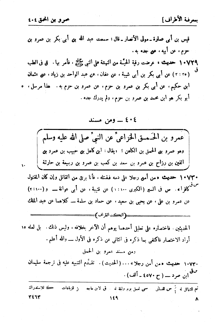 10730 -[س ق] حديث من أمن رجلاً على دمه فقتله، فأنا بريء من القاتل وإن كان المقتول كافراً. س في السير (الكبرى 100: 1) عن قتيبة، عن أبي عوانة و (100: 2) عن عمرو بن علي، عن يحيى بن سعيد، عن حماد بن سلمة - كلاهما عن عبد الملك -[150]- بن عمير، عن رفاعة بن شداد , عنه به. و (100: 3) عن إسماعيل بن مسعود، عن خالد بن الحارث و (100: 3) عن يعقوب بن إبراهيم، عن عبد الرحمن بن مهدي - كلاهما عن قرة بن خالد، عن عبد الملك بن عمير، عن عامر بن شداد , عنه نحوه. كذا في حديث قرة عامر بن شداد، والصواب رفاعة بن شداد. ق في الديات (33: 1) عن محمد بن عبد الملك بن أبي الشوارب، عن أبي عوانة به. و (33: 2) عن علي بن محمد، عن وكيع، عن ابن أبي ليلى، عن أبي عُكَّاشّة، عن رفاعة , عنه بمعناه. ز رواه مسلم بن إبراهيم، عن عبد الله بن ميسرة الحارثي، عن أبي عكاشة، عن رفاعة، عن سليمان بن صرد. ورواه الفضل بن ميسرة، عن أبي حريز، عن رفاعة، عن سليمان بن مسهر. ورواه عثمان بن عمر، عن شعبة، عن عبد الملك بن عمير، عن عامر بن شداد. ورواه إبراهيم بن يزيد بن مردانبه، عن رقبة بن مصقلة، عن عبد الملك بن عمير، عن شداد بن الحكم.