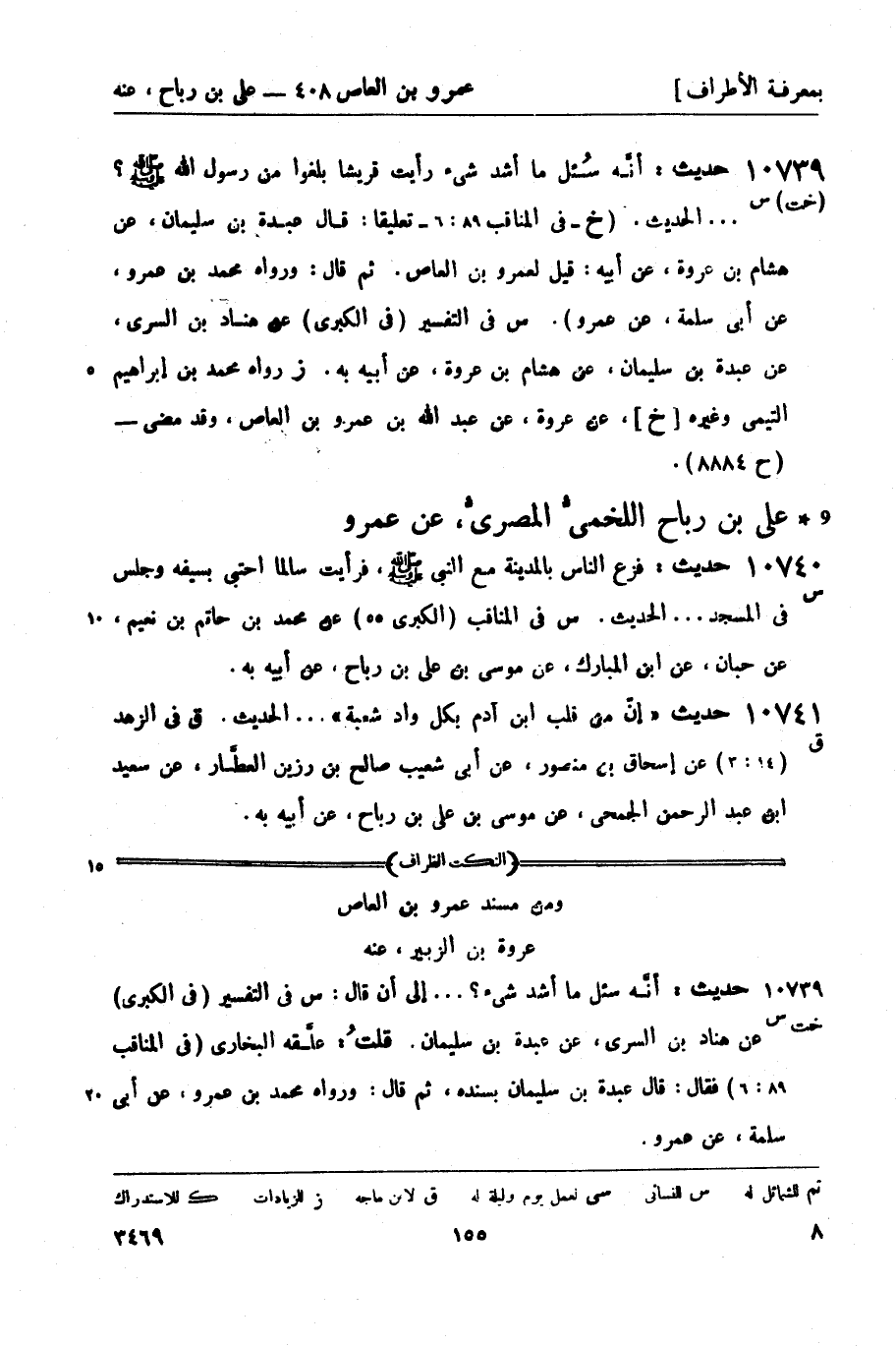 10739 -[خت] س حديث: أنَّه سُئل ما أشد شيء رأيت قريشاً بلغوا من رسول الله صَلَّى اللَّهُ عَلَيْهِ وَسَلَّمَ؟ ... الحديث. (خ - في المناقب 89: 6 - تعليقاً: قال عبدة بن سليمان، عن هشام بن عروة، عن أبيه: قيل لعمرو بن العاص. ثم قال: ورواه محمد بن عمرو، عن أبي سلمة، عن عمرو) . س في التفسير (في الكبرى) عن هناد بن السري، عن عبدة بن سليمان، عن هشام بن عروة، عن أبيه به. ز رواه محمد بن إبراهيم التيمي وغيره [خ] ، عن عروة، عن عبد الله بن عمرو بن العاص، وقد مضى - (ح 8884) .