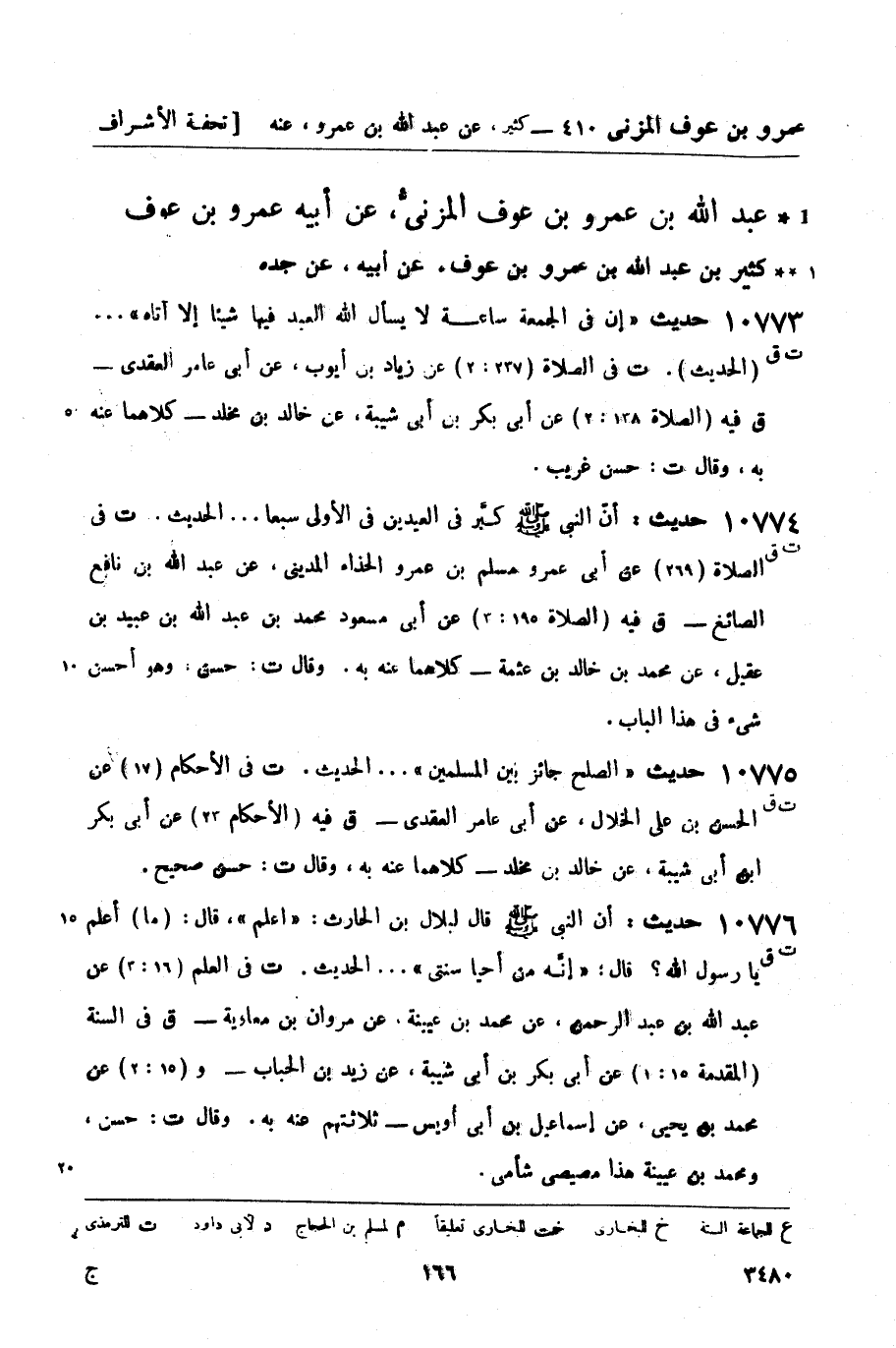 10775 -[ت ق] حديث الصلح جائز بين المسلمين ... الحديث. ت في الأحكام (17) عن الحسن بن علي الخلال، عن أبي عامر العقدي - ق فيه (الأحكام 23) عن أبي بكر بن أبي شيبة، عن خالد بن مخلد - كلاهما عنه به، وقال ت: حسن صحيح.