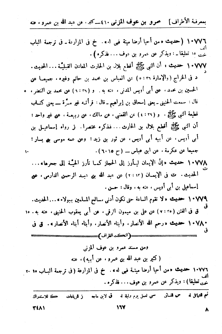 10776 - (ألف) (خت) (حديث من أحيا أرضاً ميتة فهي له. خ في المزراعة - في ترجمة الباب 15 تعليقاً -: ويذكر عن عمرو بن عوف ... فذكره) .
