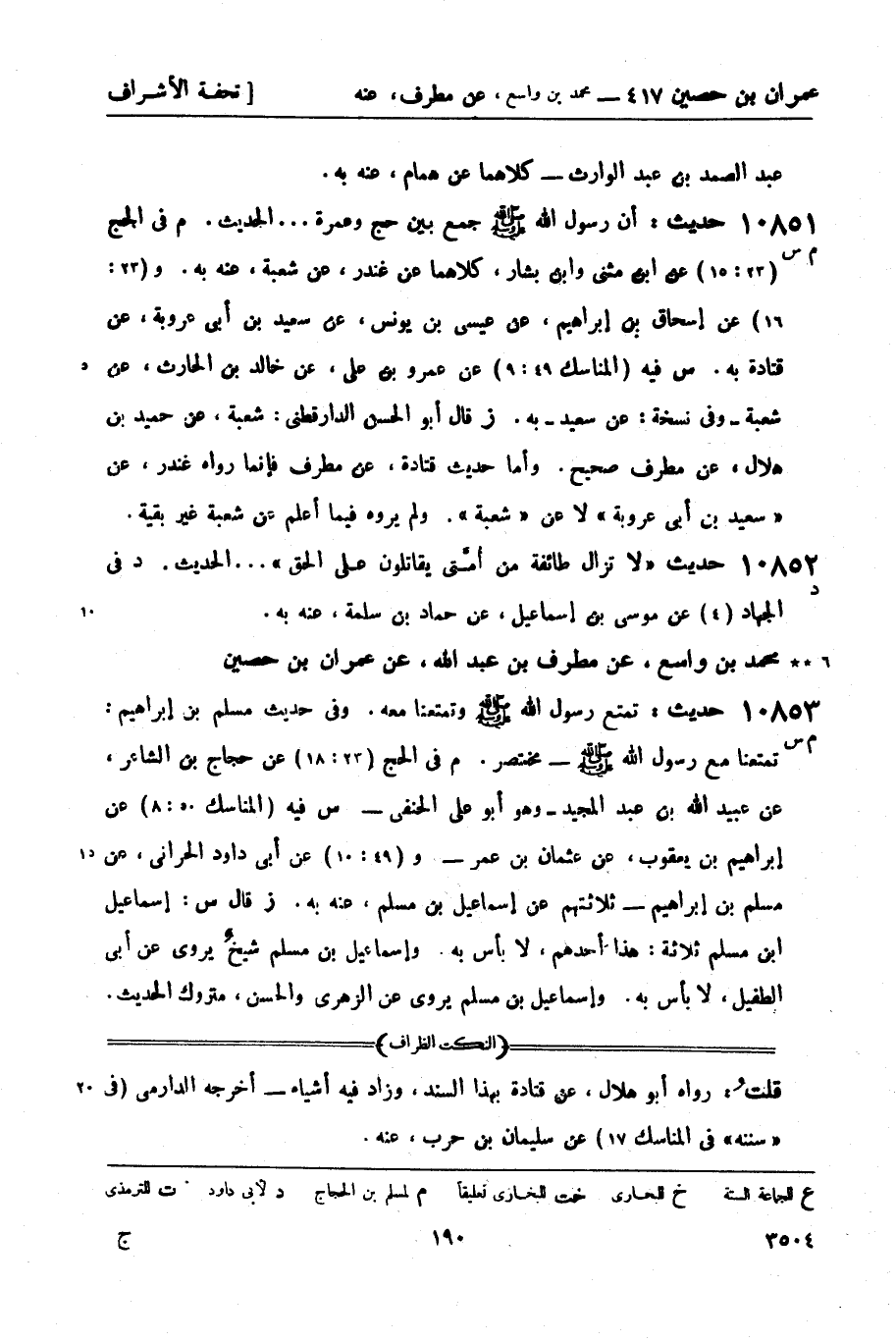 10851 -[م س] حديث: أن رسول الله صَلَّى اللَّهُ عَلَيْهِ وَسَلَّمَ جمع بين حج وعمرة ... الحديث. م فيه الحج (23: 15) عن ابن مثنى وابن بشار، كلاهما عن غندر، عن شعبة , عنه به. و (23: 16) عن إسحاق بن إبراهيم، عن عيسى بن يونس، عن سعيد بن أبي عروبة، عن قتادة به. س فيه (المناسك 49: 9) عن عمرو بن علي، عن خالد بن الحارث، عن شعبة - وفي نسخة: عن سعيد - به. ز قال أبو الحسن الدارقطني: شعبة، عن حميد بن هلال، عن مطرف صحيح. وأما حديث قتادة، عن مطرف فإنما رواه غندر، عن سعيد بن أبي عروبة لا عن شعبة. ولم يروه فيما أعلم عن شعبة غير بقية.