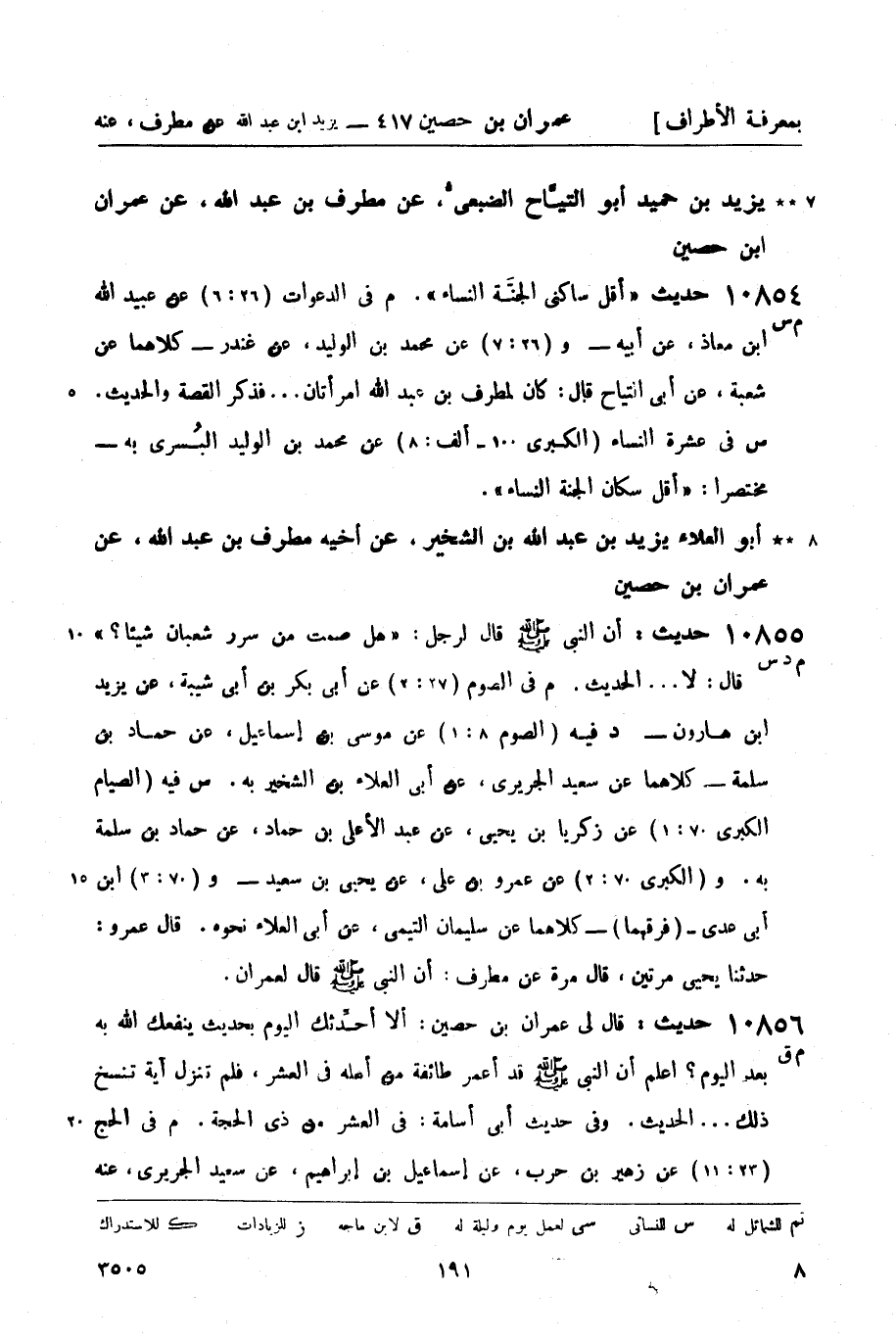 10855 -[م د س] حديث: أن النبيّ صَلَّى اللَّهُ عَلَيْهِ وَسَلَّمَ قال لرجل: هل صمت من سرر شعبان شيئاً؟ قال: لا ... الحديث. م في الصوم (27: 2) عن أبي بكر بن أبي شيبة، عن يزيد بن هارون - د فيه (الصوم 8: 1) عن موسى بن إسماعيل، عن حماد بن سلمة - كلاهما عن سعيد الجريري، عن أبي العلاء بن الشخير به. س فيه (الصيام الكبرى 70: 1) عن زكريا بن يحيى، عن عبد الأعلى بن حماد، عن حماد بن سلمة به. و (الكبرى 70: 2) عن عمرو بن علي، عن يحيى بن سعيد - و (70: 3) ابن أبي عدي - (فرقهما) - كلاهما عن سليمان التيمي، عن أبي العلاء نحوه. قال عمرو: حدثنا يحيى مرتين، قال مرة عن مطرف: أن النبيّ صَلَّى اللَّهُ عَلَيْهِ وَسَلَّمَ قال لعمران.