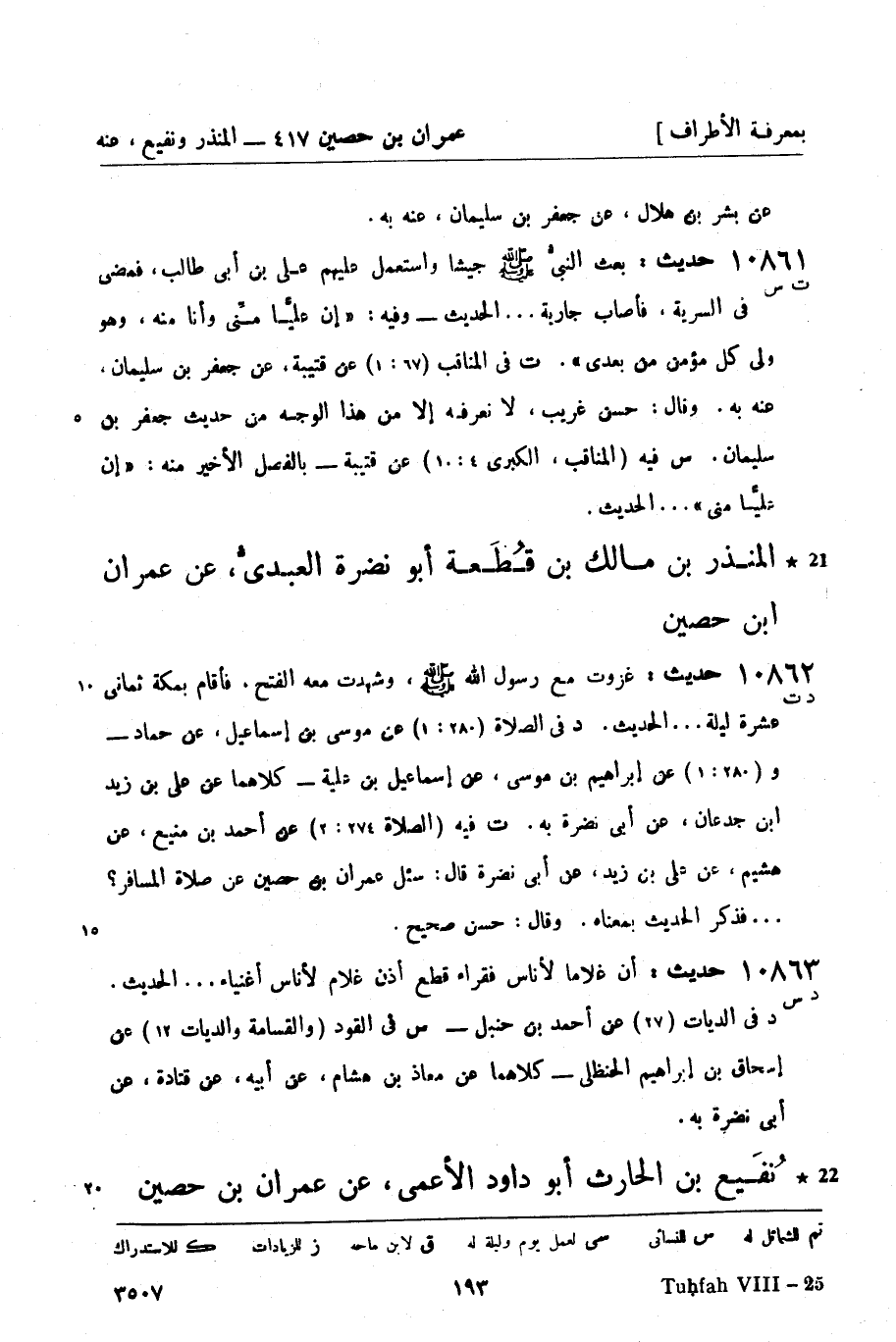 10862 -[د ت] حديث: غزوت مع رسول الله صَلَّى اللَّهُ عَلَيْهِ وَسَلَّمَ، وشهدت معه الفتح، فأقام بمكة ثماني عشرة ليلة ... الحديث. د في الصلاة (280: 1) عن موسى بن إسماعيل، عن حماد - و (280: 1) عن إبراهيم بن موسى، عن إسماعيل ابن علية - كلاهما عن علي بن زيد بن جدعان، عن أبي نضرة به. ت فيه (الصلاة 274: 2) عن أحمد بن منيع، عن هشيم، عن علي بن زيد، عن أبي نضرة قال: سئل عمران بن حصين، عن صلاة المسافر ... فذكر الحديث بمعناه وقال: حسن صحيح.
