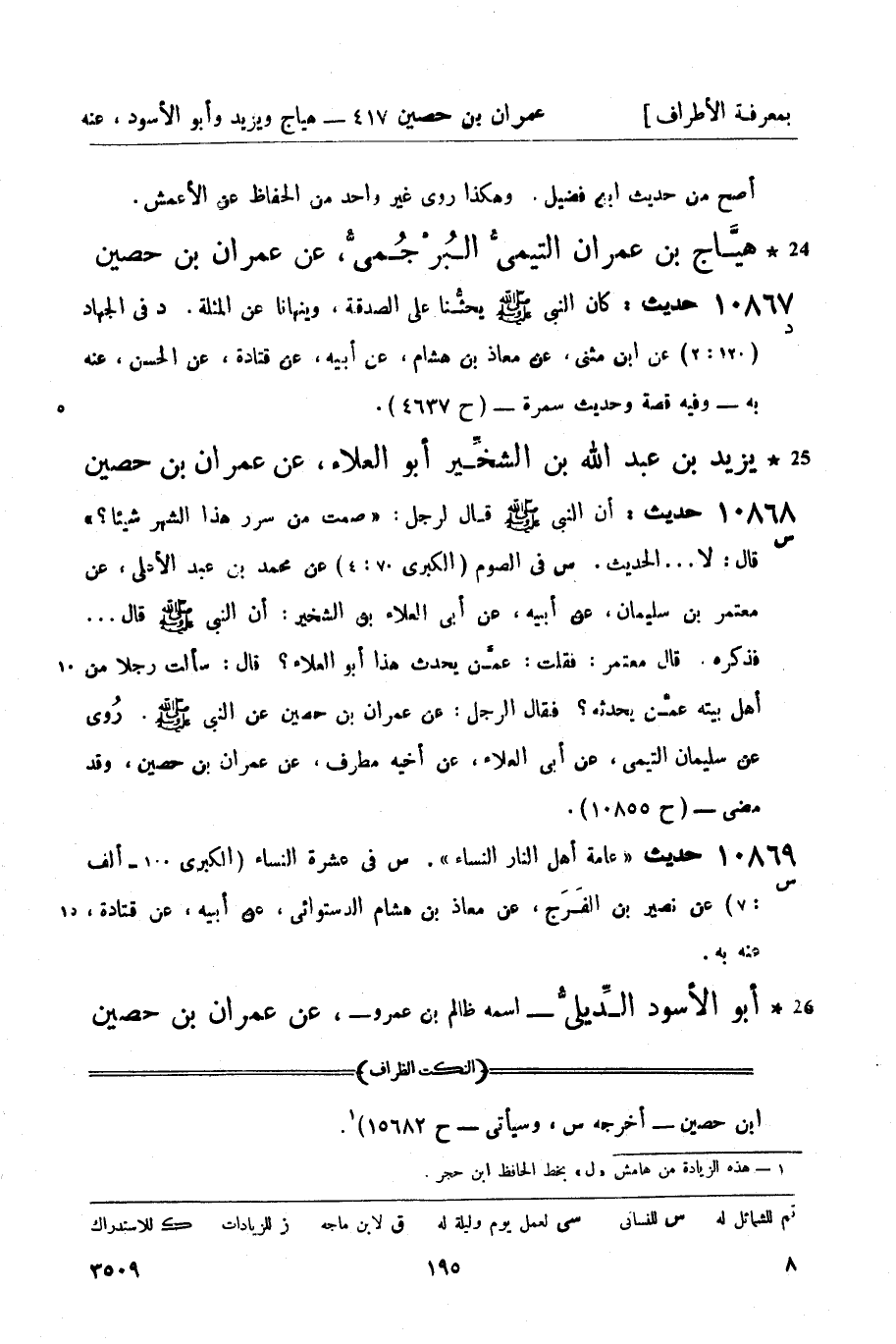10868 -[س] حديث: أن النبيّ صَلَّى اللَّهُ عَلَيْهِ وَسَلَّمَ قال لرجل: صمت من سرر هذا الشهر شيئاً؟ قال: لا ... الحديث. س في الصوم (الكبرى 70: 4) عن محمد بن عبد الأعلى، عن معتمر بن سليمان، عن أبيه، عن أبي العلاء بن الشخير: أن النبيّ صَلَّى اللَّهُ عَلَيْهِ وَسَلَّمَ قال ... فذكره. قال معتمر: فقلت: عمَّن يحدث هذا أبو العلاء؟ قال: سألت رجلاً من أهل بيته عمَّن يحدثه؟ فقال الرجل: عن عمران بن حصين عن النبيّ صَلَّى اللَّهُ عَلَيْهِ وَسَلَّمَ. روى عن سليمان التيمي، عن أبي العلاء، عن أخيه مطرف، عن عمران بن حصين، وقد مضى - (ح 10855) .
