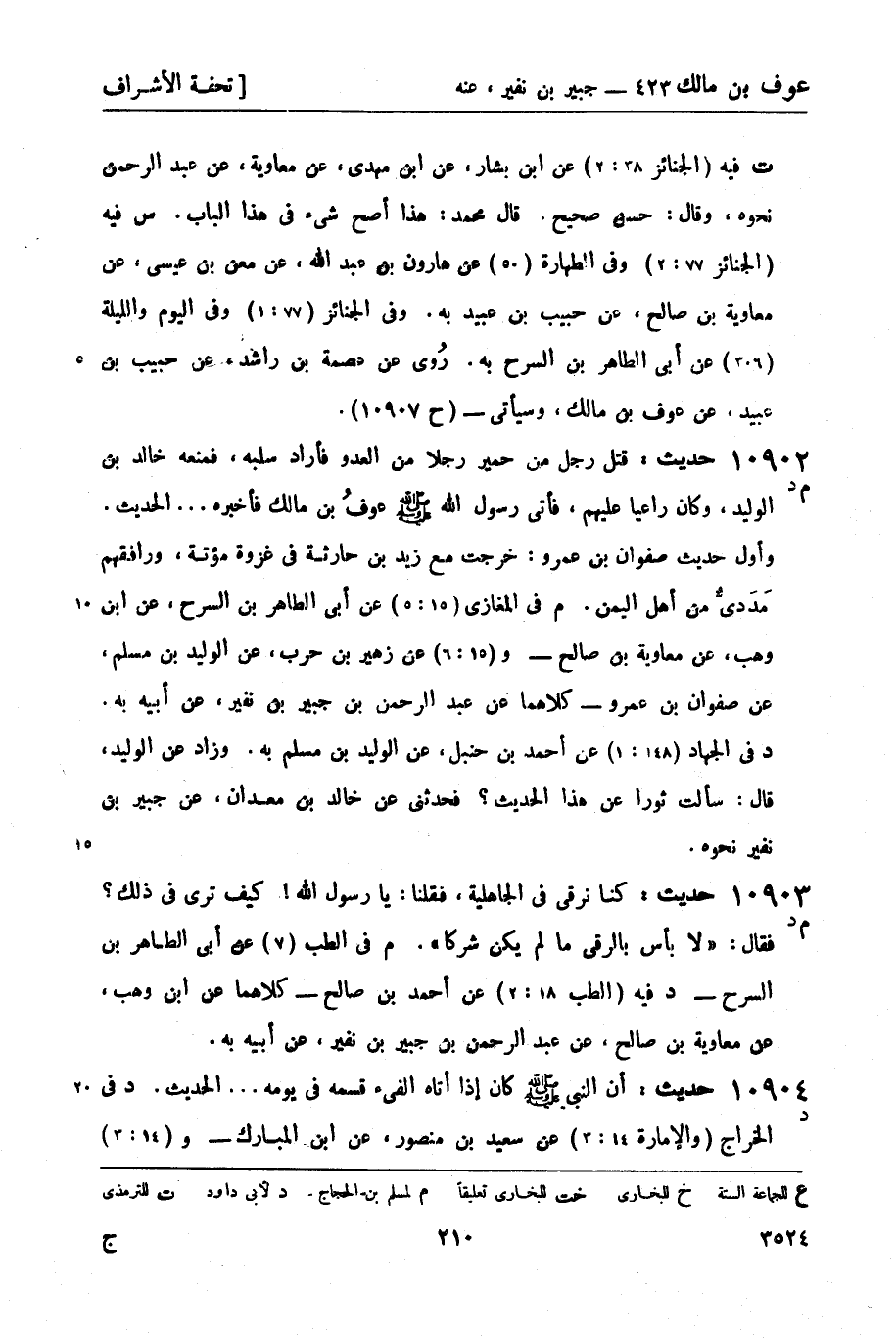 10902 -[م د] حديث: قتل رجل من حمير رجلاً من العدو فأراد سلبه، فمنعه خالد بن الوليد، وكان راعياً عليهم، فأتى رسول الله صَلَّى اللَّهُ عَلَيْهِ وَسَلَّمَ عوفُ بن مالك فأخبره ... الحديث. وأول حديث صفوان بن عمرو: خرجت مع زيد بن حارثة في غزوة مؤتة، ورافقهم مَدَديٌّ من أهل اليمن. م في المغازي (15: 5) عن أبي الطاهر بن السرح، عن ابن وهب، عن معاوية بن صالح - و (15: 6) عن زهير بن حرب، عن الوليد بن مسلم، عن صفوان بن عمرو - كلاهما عن عبد الرحمن بن جبير بن نفير، عن أبيه به. د في الجهاد (148: 1) عن أحمد بن حنبل، عن الوليد بن مسلم به. وزاد عن الوليد قال: سألت ثوراً عن هذا الحديث؟ فحدثني عن خالد بن معدان، عن جبير بن نفير نحوه.