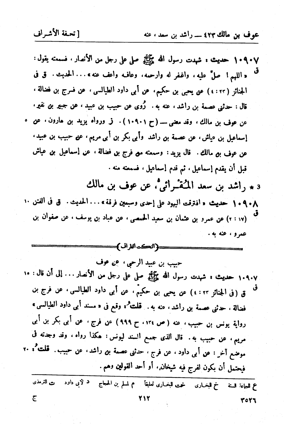 10907 -[ق] حديث: شهدت رسول الله صَلَّى اللَّهُ عَلَيْهِ وَسَلَّمَ صلى على رجل من الأنصار، فسمعته يقول: اللهم! صلِّ عليه، واغفر له وارحمه، وعافه واعف عنه ... الحديث. ق في الجنائز (23: 4) عن يحيى بن حكيم، عن أبي داود الطيالسي، عن فرج بن فضالة، قال: حدثني عصمة بن راشد , عنه به. روى عن حبيب بن عبيد، عن جبير بن نفير، عن عوف بن مالك، وقد مضى - (ح 10901) . ز ورواه يزيد بن هارون، عن إسماعيل بن عياش، عن عصمة بن راشد وأبي بكر بن أبي مريم، عن حبيب بن عبيد، عن عوف بن مالك. قال يزيد: وسمعته من فرج بن فضالة، عن إسماعيل بن عياش قبل أن يقدم إسماعيل، ثم قدم إسماعيل، فسمعته منه.