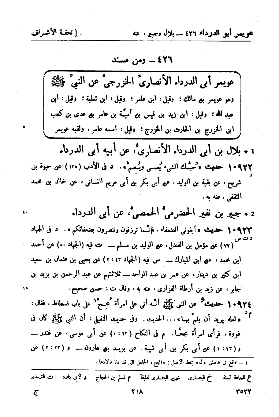 10924 -[م د] حديثٌ عن النبيّ صَلَّى اللَّهُ عَلَيْهِ وَسَلَّمَ أنَّه أتى على امرأة مُجِحَ1 على باب فسطاط، فقال: لعله يريد أن يلمَّ بها ... الحديث. وفي حديث النفيلي: أن النبيّ صَلَّى اللَّهُ عَلَيْهِ وَسَلَّمَ كان في غزوة، فرأى امرأة مجحَّاً. م في النكاح (23: 1) عن أبي موسى، عن غندر - و (23: 2) عن أبي بكر بن أبي شيبة، عن يزيد بن هارون - و (23: 2) عن -[219]- بندار، عن أبي داود الطيالسي - د فيه (النكاح 45: 2) عن النفيلي، عن مسكين بن بكير - أربعتهم عن شعبة، عن يزيد بن خمير، عن عبد الرحمن بن جبير بن نفير، عن أبيه به.
