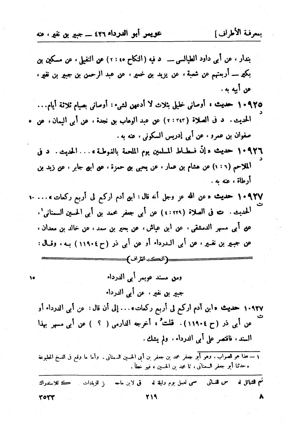 10926 -[د] حديث إنّ فسطاط المسلمين يوم الملحمة بالغوطة ... الحديث. د في الملاحم (6: 1) عن هشام بن عمار، عن يحيى بن حمزة، عن ابن جابر، عن زيد بن أرطاة , عنه به.