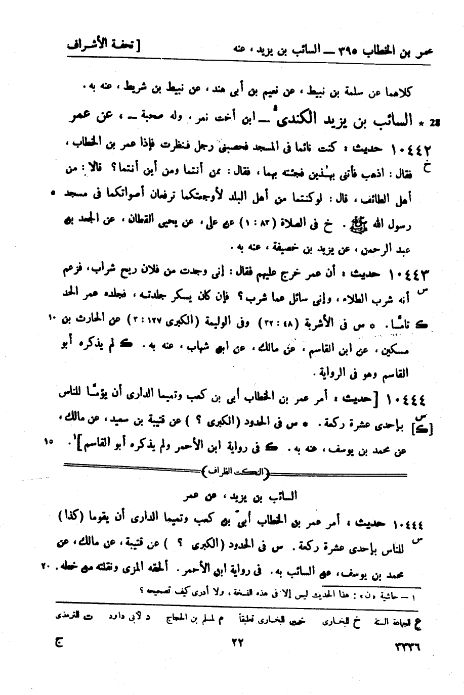 10442 -[خ] حديث: كنت نائماً في المسجد فحصبني رجل فنظرت فإذا عمر بن الخطاب، فقال: اذهب فأتني بهذين فجئته بهما، فقال: ممن أنتما ومن أين أنتما؟ قالا: من أهل الطائف، قال: لو كنتما من أهل البلد لأوجعتكما ترفعان أصواتكما في مسجد رسول الله صَلَّى اللَّهُ عَلَيْهِ وَسَلَّمَ. (خ) في الصلاة (83: 1) عن علي، عن يحيى القطان، عن الجعد بن عبد الرحمن، عن يزيد بن خصيفة، عنه به.