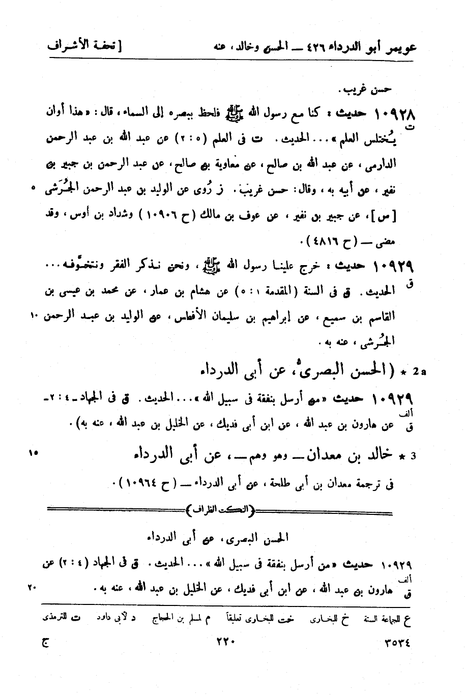 10928 -[ت] حديث: كنا مع رسول الله صَلَّى اللَّهُ عَلَيْهِ وَسَلَّمَ فلحظ ببصره إلى السماء، قال: هذا أوان يُختلس العلم ... الحديث. ت في العلم (5: 2) عن عبد الله بن عبد الرحمن الدارمي، عن عبد الله بن صالح، عن معاوية بن صالح، عن عبد الرحمن بن جبير بن نفير، عن أبيه به، وقال: حسن غريب. ز روى عن الوليد بن عبد الرحمن الجُرَشي [س] ، عن جبير بن نفير، عن عوف بن مالك (ح 10906) وشداد بن أَوس، وقد مضى - (ح 4816) .
