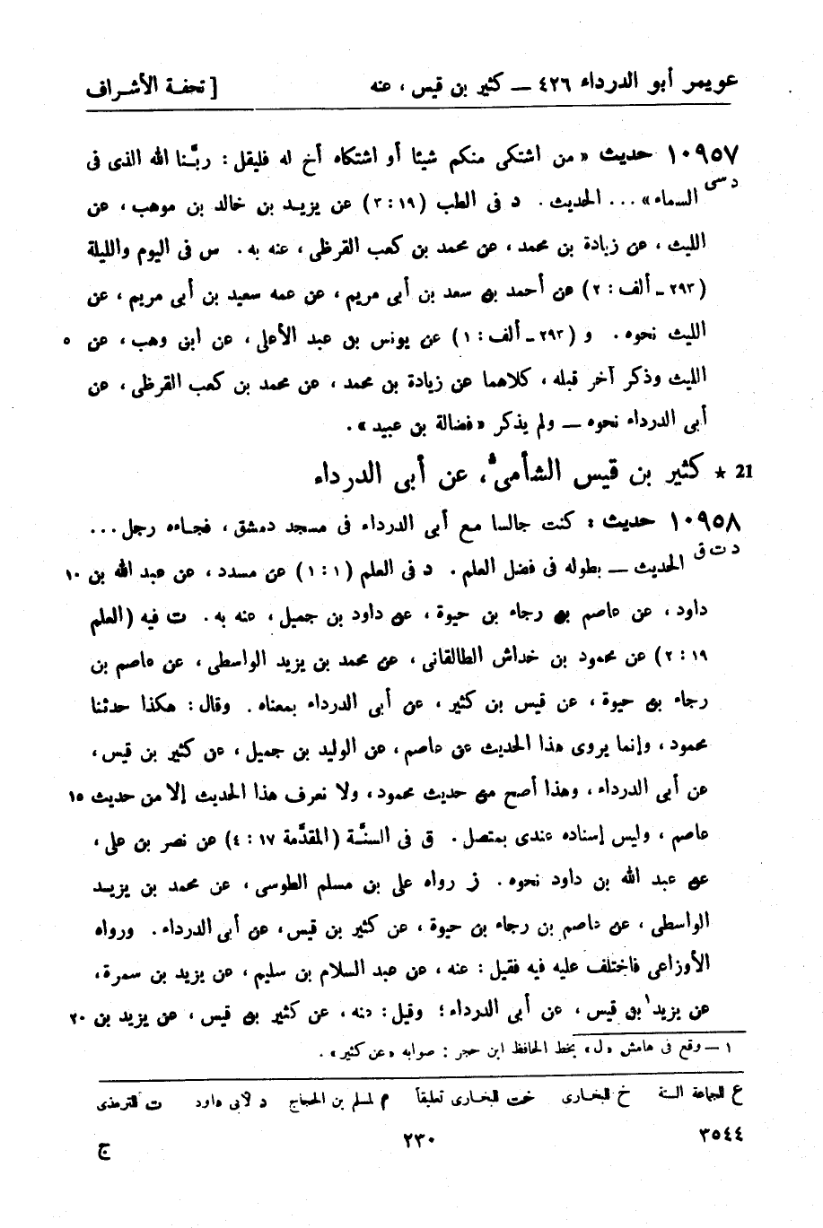 10958 -[د ت ق] حديث: كنت جالساً مع أبي الدرداء في مسجد دمشق، فجاءه رجل ... الحديث - بطوله في فضل العلم. د في العلم (1: 1) عن مسدد، عن عبد الله بن داود، عن عاصم بن رجاء بن حيوه، عن داود بن جميل , عنه به. ت فيه (العلم 19: 2) عن محمود بن خداش الطالقاني، عن محمد بن يزيد الواسطي، عن عاصم بن رجاء بن حيوه، عن قيس بن كثير، عن أبي الدرداء بمعناه. وقال: هكذا حدثنا محمود، وإنما يروى هذا الحديث عن عاصم، عن الوليد بن جميل، عن كثير بن قيس، عن أبي الدرداء، وهذا أصح من حديث محمود، ولا نعرف هذا الحديث إلا من حديث عاصم، وليس إسناده عندي بمتصل. ق في السنَّة (المقدَّمة 17: 4) عن نصر بن علي، عن عبد الله بن داود نحوه. ز رواه علي بن مسلم الطوسي، عن محمد بن يزيد الواسطي، عن عاصم بن رجاء بن حيوه، عن كثير بن قيس، عن أبي الدرداء. ورواه الأوزاعي فاختلف عليه فيه فقيل: عنه، عن عبد السلام بن سليم، عن يزيد بن سمرة، عن يزيد1 بن قيس، عن أبي الدرداء؛ وقيل: عنه، عن كثير بن قيس، عن يزيد بن -[231]- سمرة، عن أبي الدرداء؛ وقيل: عنه كثير بن قيس، عن أبي الدرداء، وروى عن عثمان بن أبي سودة، عن أبي الدرداء، وقد مضى - (ح 10951) .