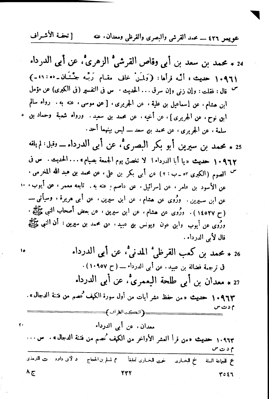 10962 -[س] حديث يا أبا الدرداء! لا تخصنّ يوم الجمعة بصيام ... الحديث. س في الصوم (الكبرى 53 - ب: 2) عن أبي بكر بن علي، عن محمد بن عبد الله المخرمي، عن الأسود بن عامر، عن إسرائيل، عن عاصم , عنه به. تابعه معمر، عن أيوب، عن ابن سيرين. وروى عن هشام، عن ابن سيرين، عن أبي هريرة، وسيأتي - (ح 14527) . وروى عن هشام، عن ابن سيرين، عن بعض أصحاب النبيّ صَلَّى اللَّهُ عَلَيْهِ وَسَلَّمَ. وروى عن أيوب وابن عون ويونس بن عبيد، عن محمد بن سيرين: أن النبيّ صَلَّى اللَّهُ عَلَيْهِ وَسَلَّمَ قال لأبي الدرداء.