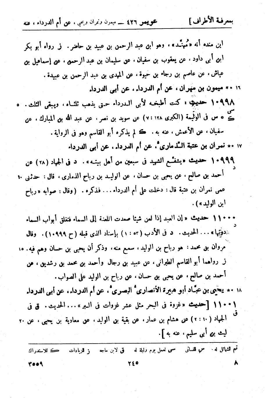 10999 -[د] حديث يشفَّع الشهيد في سبعين من أهل بيته. د في الجهاد (28) عن أحمد بن صالح، عن يحيى بن حسان، عن الوليد بن رباح الذماري، قال: حدثني عمي نمران بن عتبة قال: دخلت على أُم الدرداء ... فذكره. (وقال: صوابه، رباح بن الوليد) .