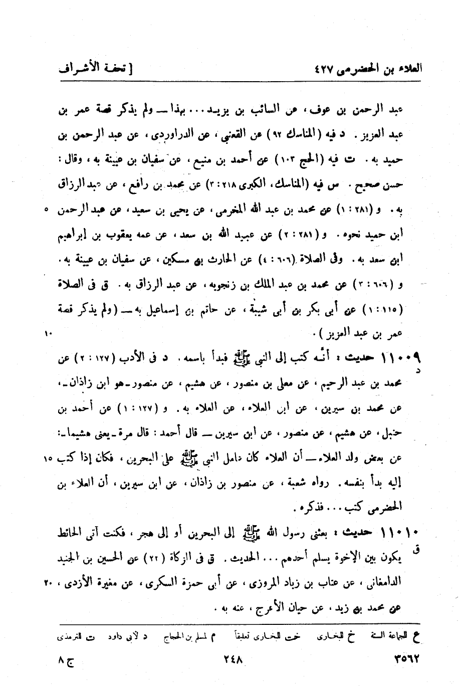 11009 -[د] حديث: أنَّه كتب إلى النبيّ صَلَّى اللَّهُ عَلَيْهِ وَسَلَّمَ فبدأ باسمه. د في الأدب (127: 2) عن محمد بن عبد الرحيم، عن معلي بن منصور، عن هشيم، عن منصور هو ابن زاذان -، محمد بن سيرين، عن ابن العلاء، عن العلاء به. و (127: 1) عن أحمد بن حنبل، عن هشيم، عن منصور، عن ابن سيرين - قال أحمد: قال مرة - يعني هشيماً -: عن بعض ولد العلاء - أن العلاء كان عامل النبيّ صَلَّى اللَّهُ عَلَيْهِ وَسَلَّمَ على البحرين، فكان إذا كتب إليه بدأ بنفسه. رواه شعبة، عن منصور بن زاذان، عن ابن سيرين، أن العلاء بن الحضرمي كتب ... فذكره.