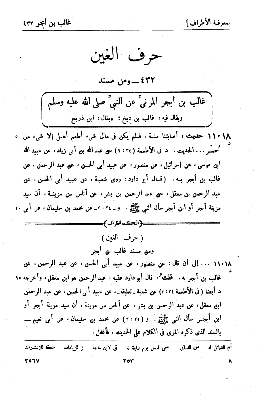 11018 -[د] حديث: أصابتنا سنة، فلم يكن في مالي شيء أطعم أهلي إلا شيء من حُمْر ... الحديث. د في الأطعمة (34: 2) عن عبد الله بن أبي زياد، عن عبيد الله بن موسى، عن إسرائيل، عن منصور، عن عبيد أبي الحسن، عن عبد الرحمن، عن غالب بن أبجر به. (قال أبو داود: روى شعبة، عن عبيد أبي الحسن، عن عبد الرحمن بن معقل، عن عبد الرحمن بن بشر، عن أناس من مزينة، أن سيد مزينة أبجر أو ابن أبجر سأل النبيّ صَلَّى اللَّهُ عَلَيْهِ وَسَلَّمَ. و 34: 3 -، عن محمد بن سليمان، عن أبي -[254]- نعيم، عن مسعر، عن ابن عبيد، عن ابن معقل، عن رجلين من مزينة - أحدهما عبد الله بن عمرو بن عويم، والآخر غالب بن أبجر - به.) . رواه أبو أحمد الزبيري وأبو نعيم، عن مسعر بن كدام، عن عبيد بن حسن، عن ابن معقل - ولم يسمِّه -، عن رجلين من مزينة، أحدهما: عبد الله بن عمرو بن بلبل؛ وقال أبو نعيم: ابن أويم، والآخر غالب بن أبجر حدَّث أحدهما عن الآخر. قال أبو نعيم: قال مسعر: أرى غالباً أتى النبيّ صَلَّى اللَّهُ عَلَيْهِ وَسَلَّمَ. ورواه غيرهما عن مسعر، عن عبيد بن حسن، عن [ابن] معقل، عن أناس من مزينة الظاهرة، عن غالب بن أبجر. ورواه أبو العميس، عن عبيد بن حسن، عن عبد الله بن معقل، عن غالب بن أبجر. ورواه شريك، عن منصور، عن عبيد أبي الحسن، عن غالب بن ديخ. ورواه يونس بن حبيب، عن أبي داود، عن شعبة، عن عبيد بن الحسن قال: سمعت عبد الله بن معقل1، عن عبد الله بن بشر، عن ناس من مزينة الظاهرة، أن أبجر أو ابن أبجر سأل النبيّ صَلَّى اللَّهُ عَلَيْهِ وَسَلَّمَ؟.... فذكره. ورواه أحمد بن إبراهيم الدورقي، عن أبي داود، عن شعبة، عن عبيد بن حسن، قال: سمعت ابن معقل - ولم يسمِّه -، عن عبد الرحمن بن بشر، عن ناس من مزينة الظاهرة، أن أبجر أو ابن أبجر - شك شعبة ... فذكره. ورواه وكيع، عن شعبة، عن عبيد، عن عبد الرحمن بن معقل، عن ناس من مزينة، عن غالب بن أبجر. ورواه وكيع أيضاً عن مسعر، عن عبيد، عن عبد الرحمن بن معقل - موقوفاً. ز وقيل: عن وكيع، عن مسعر، عن عبيد، عن ابن معقل المزني، عن ناس من مزينة الظاهرة، عن غالب بن أبجر قال: سألت رسول الله صَلَّى اللَّهُ عَلَيْهِ وَسَلَّمَ ... فذكره.