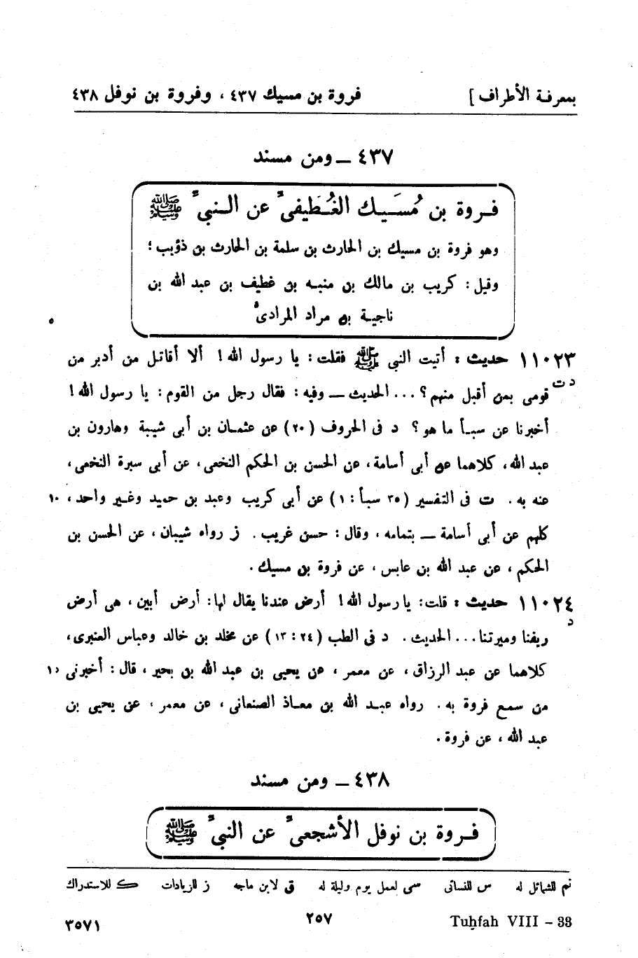 ومن مسند فروة بن مُسَيك الغُطَيفيِّ عن النبي صَلَّى اللَّهُ عَلَيْهِ وَسَلَّمَ وهو فروة بن مسيك بن الحارث بن سلمة بن الحارث بن ذؤيب؛ وقيل: كريب بن مالك بن منبه بن غطيف بن عبد الله بن ناجية بن مراد المراديُّ