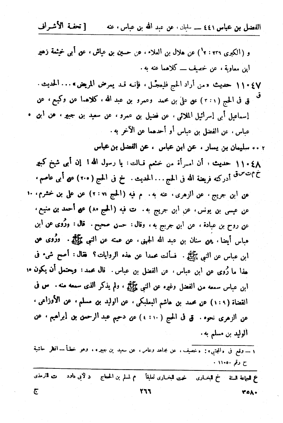 11048 -[خ م ت س ق] حديث: أن امرأة من خشعم قالت: يا رسول الله! إن أبي شيخ كبير أدركته فريضة الله في الحج ... الحديث. خ في الحج (205) عن أبي عاصم، عن ابن جريج، عن الزهري، عنه به. م فيه (الحج 71: 2) عن علي بن خشرم، عن عيسى بن يونس، عن ابن جريج به. ت فيه (الحج 85) عن أحمد بن منيع، عن روح بن عبادة، عن ابن جريج به، وقال: حسن صحيح. قال: وروى عن ابن عباس أيضاً عن سنان بن عبد الله الجهني، عن عمته عن النبيّ صَلَّى اللَّهُ عَلَيْهِ وَسَلَّمَ. وروى عن ابن عباس عن النبيّ صَلَّى اللَّهُ عَلَيْهِ وَسَلَّمَ. فسألت محمداً عن هذه الروايات؟ فقال: أصح شيء في هذا ما روى عن ابن عباس، عن الفضل بن عباس. قال محمد: ويحتمل أن يكون ابن عباس سمعه من الفضل وغيره عن النبيّ صَلَّى اللَّهُ عَلَيْهِ وَسَلَّمَ، ولم يذكر الذي سمعه منه. س في القضاة (9: 1) عن محمد بن هاشم البعلبكي، عن الوليد بن مسلم، عن الأوزاعي، عن الزهري نحوه. ق في الحج (10: 4) عن دحيم عبد الرحمن بن إبراهيم، عن الوليد بن مسلم به.