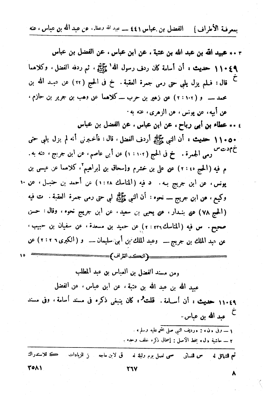 11050 -[خ م د ت س] حديث: أن النبيّ صَلَّى اللَّهُ عَلَيْهِ وَسَلَّمَ أردف الفضل، قال: فأخبرني أنه لم يزل يلبي حتى رمى الجمرة. خ في الحج (102: 1) عن أبي عاصم، عن ابن جريج، عنه به. م فيه (الحج 45: 2) عن علي بن خشرم وإسحاق بن إبراهيم، كلاهما عن عيسى بن يونس، عن ابن جريج به. د فيه (المناسك 28: 1) عن أحمد بن حنبل، عن وكيع، عن ابن جريج - نحوه: أن النبيّ صَلَّى اللَّهُ عَلَيْهِ وَسَلَّمَ لبى حتى رمى جمرة العقبة. ت فيه (الحج 78) عن بندار، عن يحيى بن سعيد، عن ابن جريج نحوه، وقال: حسن صحيح. س فيه (المناسك 216: 1) عن حميد بن مسعدة، عن سفيان بن حبيب، عن عبد الملك بن جريج - وعبد الملك بن أبي سليمان - و (الكبرى 26: 2) عن -[268]- هلال بن العلاء، عن حسين بن عياش، عن أبي خيثمة زهير بن معاوية، عن خصيف - ثلاثتهم عن عطاء نحوه.