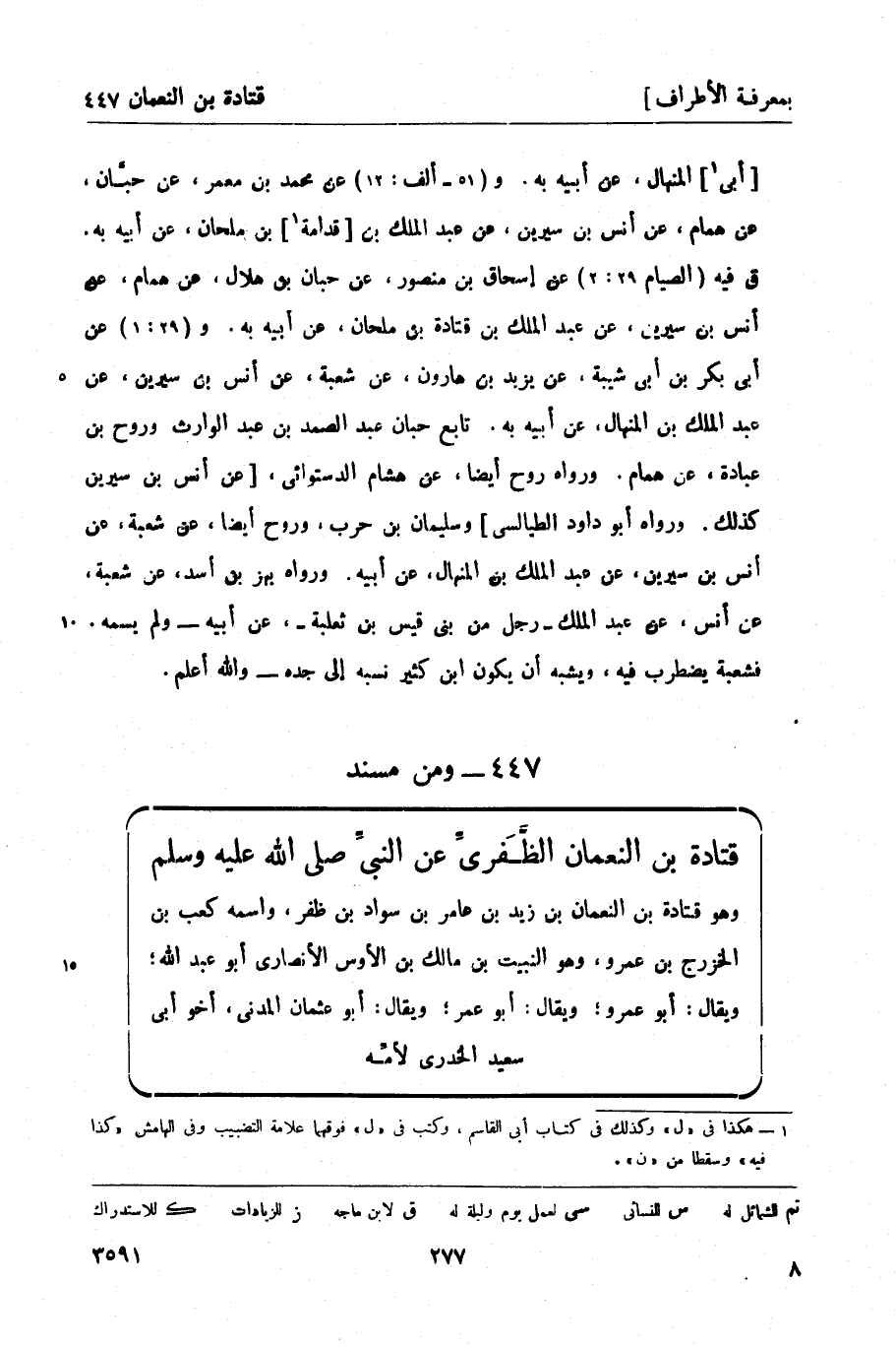 ومن مسند قتادة بن النعمان الظَّفَريِّ عن النبي صَلَّى اللَّهُ عَلَيْهِ وَسَلَّمَ وهو قتادة بن النعمان بن زيد بن عامر بن سواد بن ظفر، واسمه كعب بن الخزرج بن عمرو، وهو النبيت بن مالك بن الأوس الأنصاري أبو عبد الله؛ ويقال: أبو عمرو؛ ويقال: أبو عمر؛ ويقال: أبو عثمان المدني، أخو أبي سعيد الخدري لأمِّه