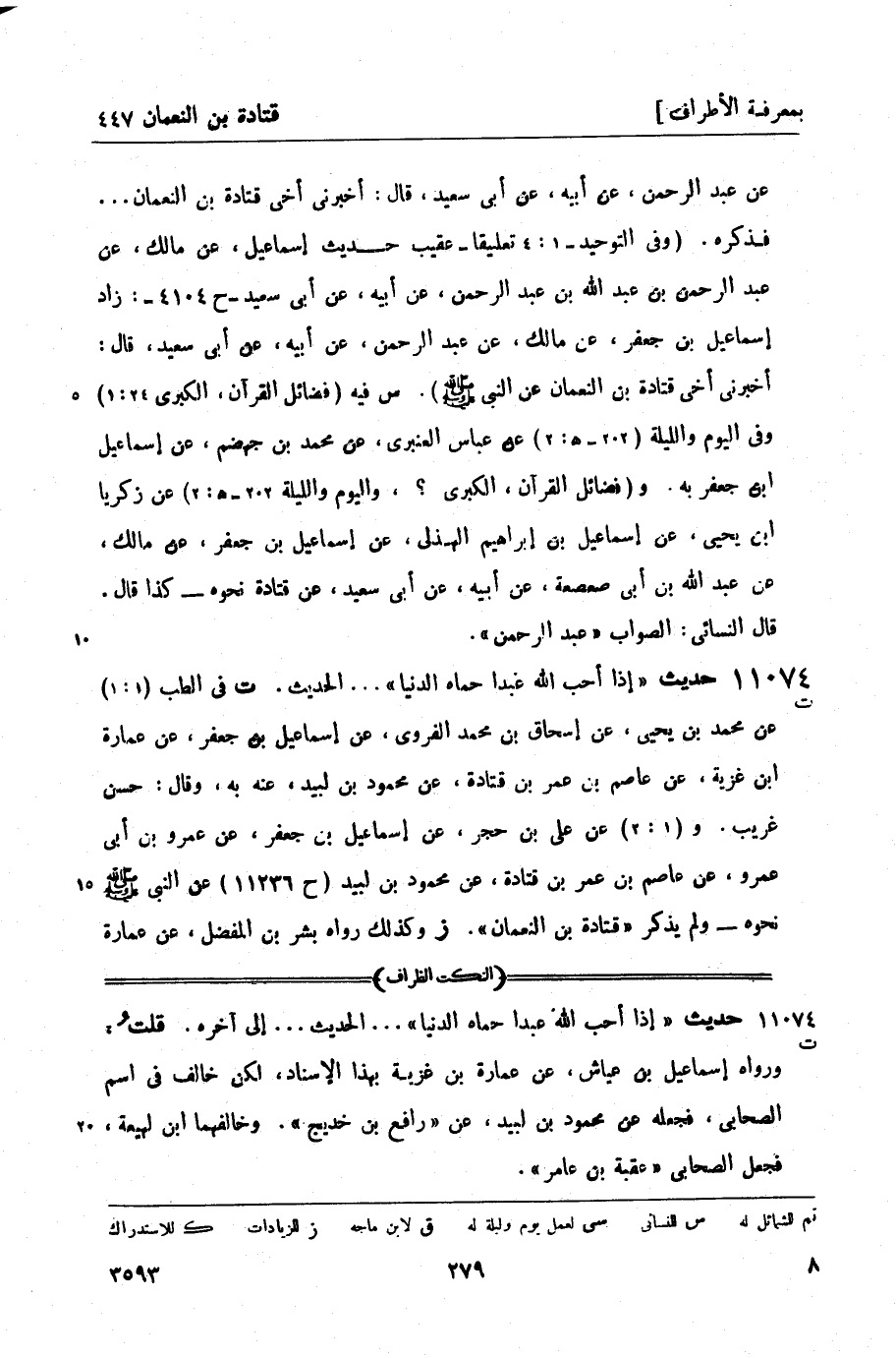 11074 -[ت] حديث: إذا أحب الله عبداً حماه الدنيا ... الحديث. ت في الطب (1: 1) عن محمد بن يحيى، عن إسحاق بن محمد الفروي، عن إسماعيل بن جعفر، عن عمارة بن غزية، عن عاصم بن عمر بن قتادة، عن محمود بن لبيد، عنه به. وقال: حسن غريب. و (1: 2) عن علي بن حجر، عن إسماعيل بن جعفر، عن عمرو بن أبي عمرو، عن عاصم بن عمر بن قتادة، عن محمود بن لبيد (ح 11236) عن النبيّ صَلَّى اللَّهُ عَلَيْهِ وَسَلَّمَ نحوه - ولم يذكر قتادة بن النعمان. ز وكذلك رواه بشر بن المفضل، عن عمارة -[280]- بن غزية.
