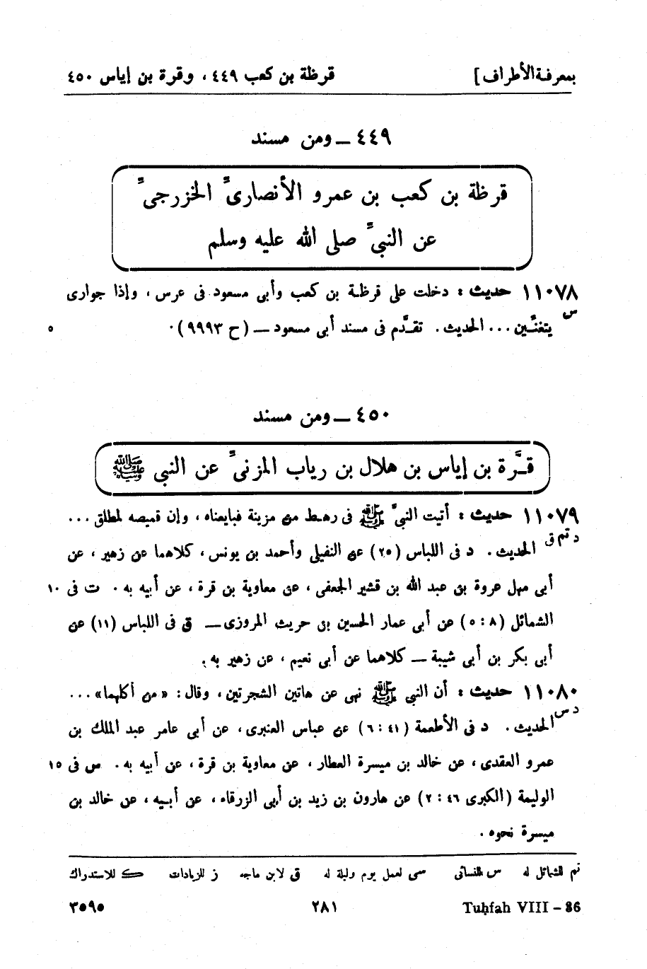 11079 - (د تم ق) حديث: أتيت النبيَّ صَلَّى اللَّهُ عَلَيْهِ وَسَلَّمَ في رهط من مزينة فبايعناه، وإن قميصه لمطلق ... الحديث. د في اللباس (25) عن النفيلي وأحمد بن يونس، كلاهما عن زهير، عن أبي مهل عروة بن عبد الله بن قشير الجعفي، عن معاوية بن قرة، عن أبيه به. ت في الشمائل (8: 5) عن أبي عمار الحسين بن حريث المروزي - ق في اللباس (11) عن أبي بكر بن أبي شيبة - كلاهما عن أبي نعيم، عن زهير به.