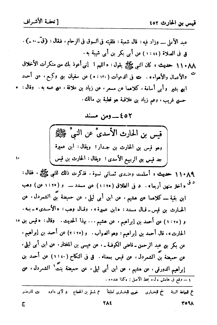 11089 -[د ق] حديث: أسلمت وعندي ثماني نسوة، فذكرت ذلك للنبيّ صَلَّى اللَّهُ عَلَيْهِ وَسَلَّمَ، فقال: اختر منهن أربعاً. د في الطلاق (25: 1) عن مسدد - و (25: 1 عن) وهب بن بقية - كلاهما عن هشيم، عن ابن أبي ليلى، عن حميضة بن الشمردل، عن الحارث بن قيس - قال مسدد: ابن عميرة، وقال وهب: الأسدي - به. و (25: 1) عن أحمد بن إبراهيم، عن هشيم ... بهذا الحديث. وقال: قيس بن الحارث، قال أحمد بن إبراهيم: وهو الصواب. و (25: 2) عن أحمد بن إبراهيم، عن بكر بن عبد الرحمن - قاضي الكوفة -، عن عيسى بن المختار، عن ابن أبي ليلى، عن حميضة بن الشمردل، عن قيس بمعناه. ق في النكاح (40: 1) عن أحمد بن إبراهيم الدورقي، عن هشيم، عن ابن أبي ليلى، عن حميضة بنت1 الشمردل، -[285]- عن قيس بن الحارث به. رواه هشيم أيضاً عن مغيرة، عن بعض ولد الحارث بن قيس بن عميرة: أن الحارث بن قيس أسلم ... فذكره. ز ورواه سعيد بن منصور، عن هشيم، عن الكلبي، عن حميضة بن الشمردل، عن الحارث بن قيس بن عمير وتابعه إسحاق بن راهويه، عن جرير، عن الكلبي.