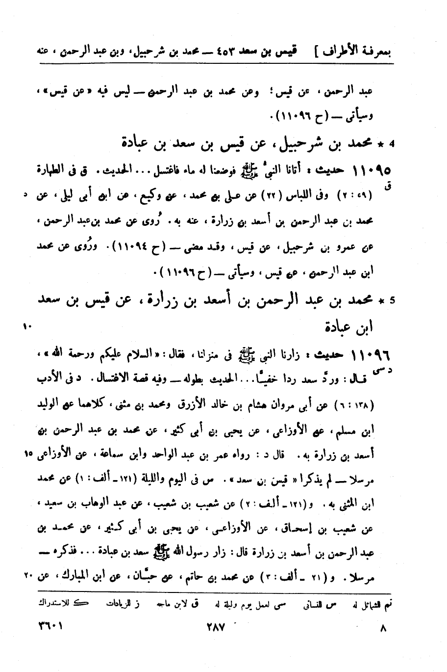 11096 -[د سي] حديث: زارنا النبيّ صَلَّى اللَّهُ عَلَيْهِ وَسَلَّمَ في منزلنا، فقال: السلام عليكم ورحمة الله، قال: وردَّ سعد رداً خفيَّاً ... الحديث. بطوله - وفيه قصة الاغتسال. د في الأدب (138: 6) عن أبي مروان هشام بن خالد الأزرق ومحمد بن مثنى، كلاهما عن الوليد بن مسلم، عن الأوزاعي، عن يحيى بن أبي كثير، عن محمد بن عبد الرحمن بن أسعد بن زرارة به. قال د: رواه عمر بن عبد الواحد وابن سماعة، عن الأوزاعي مرسلاً - لم يذكرا قيس بن سعد. س في اليوم والليلة (121 - ألف: 1) عن محمد بن المثنى به. و (121 - ألف: 2) عن شعيب بن شعيب، عن عبد الوهاب بن سعيد، عن شعيب بن إسحاق، عن الأوزاعي، عن يحيى بن أبي كثير، عن محمد بن عبد الرحمن بن أسعد بن زرارة قال: زار رسول الله صَلَّى اللَّهُ عَلَيْهِ وَسَلَّمَ سعد بن عبادة ... فذكره - مرسلاً. و (21 - ألف: 3) عن محمد بن حاتم، عن حبَّان، عن ابن المبارك، عن -[288]- الأوزاعي، عن يحيى بن أبي كثير، عن محمد بن عبد الرحمن بن ثوبان: أن النبيّ صَلَّى اللَّهُ عَلَيْهِ وَسَلَّمَ أتى سعداً زائراً - مرسل - كذا قال ابن ثوبان. روى عن محمد بن عبد الرحمن، عن عمرو بن شرحبيل - (ح 11094) . وقيل: عن محمد بن عبد الرحمن، عن محمد بن شرحبيل، عن قيس، وقد مضى - (ح 11095) .
