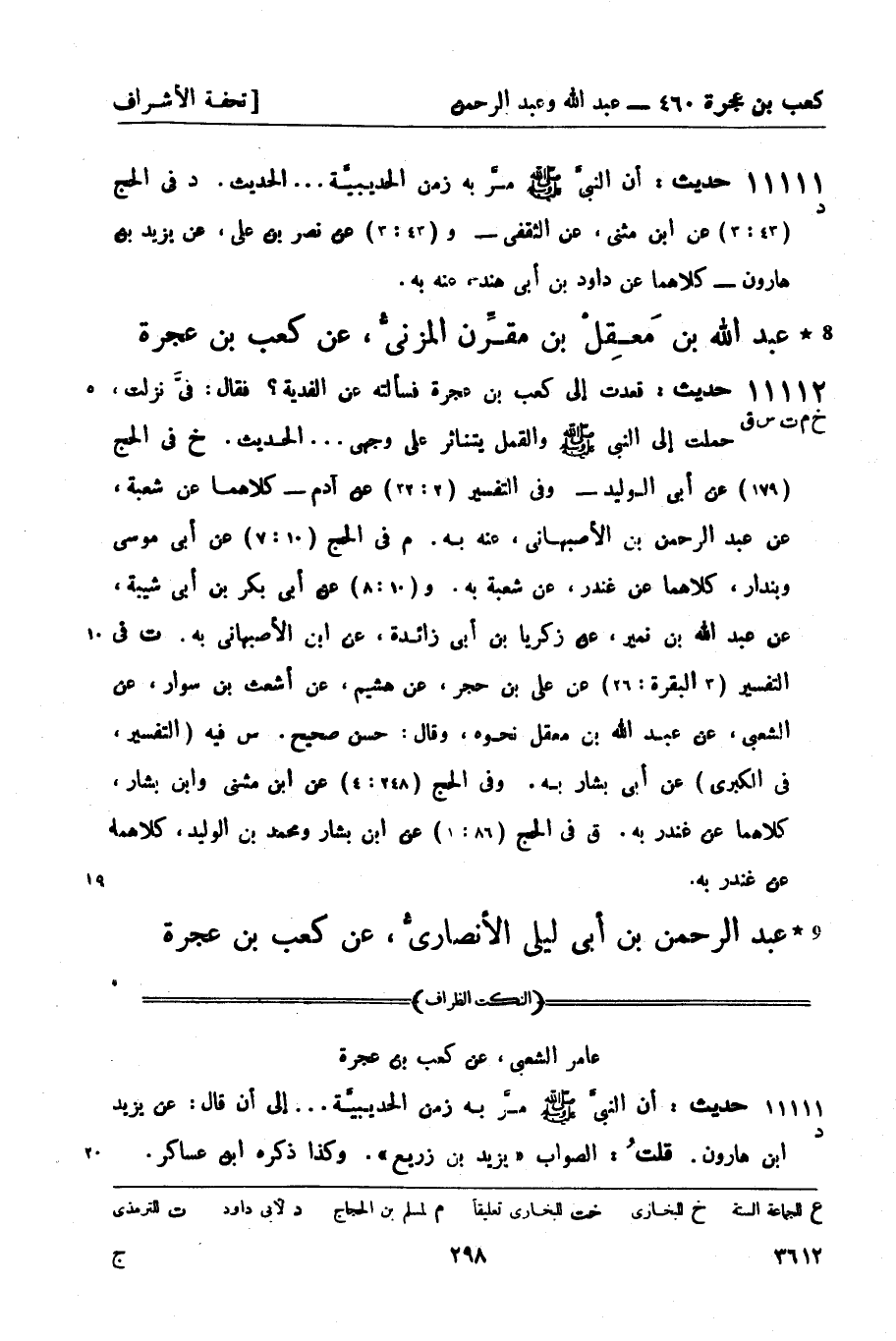 11112 -[خ م ت س ق] حديث: قعدت إلى كعب بن عجرة فسألته عن الفدية؟ فقال: فيَّ نزلت، حملت إلى النبيّ صَلَّى اللَّهُ عَلَيْهِ وَسَلَّمَ والقمل يتناثر على وجهي ... الحديث. خ في الحج (179) عن أبي الوليد - وفي التفسير (2: 32) عن آدم - كلاهما عن شعبة، عن عبد الرحمن بن الأصبهاني، عنه به. م في الحج (10: 7) عن أبي موسى وبندار، كلاهما عن غندر، عن شعبة به. و (10: 8) عن أبي بكر بن أبي شيبة، عن عبد الله بن نمير، عن زكريا بن أبي زائدة، عن ابن الأصبهاني به. ت في التفسير (3 البقرة: 26) عن علي بن حجر، عن هشيم، عن أشعث بن سوار، عن الشعبي، عن عبد الله بن معقل نحوه، وقال: حسن صحيح. س فيه (التفسير، في الكبرى) عن أبي بشار به. وفي الحج (248: 4) عن ابن مثنى وابن بشار، كلاهما عن غندر به. ق في الحج (86: 1) عن ابن بشار ومحمد بن الوليد، كلاهما عن غندر به.