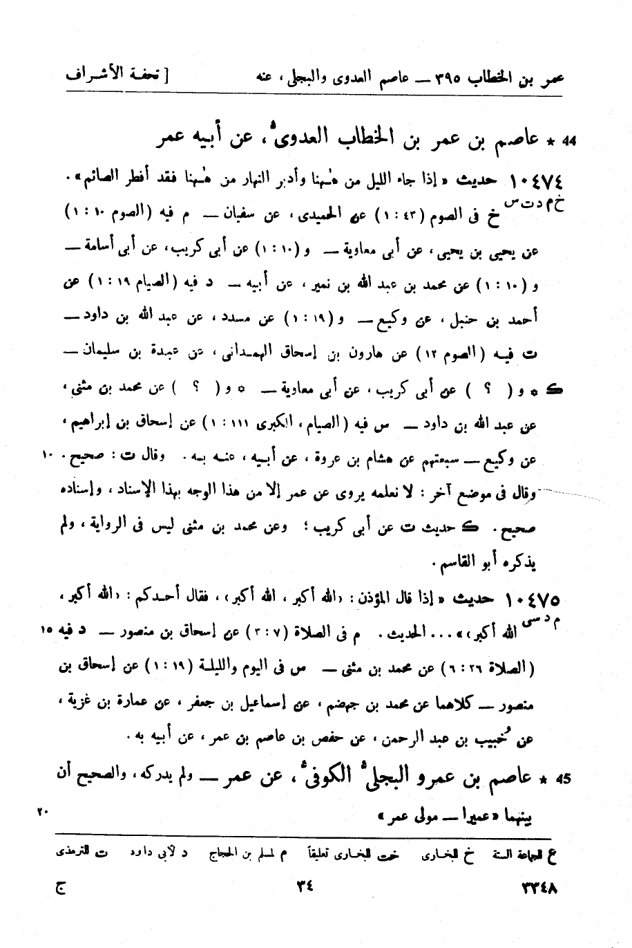 10474 -[خ م د ت س] حديث إذا جاء الليل من هاهنا وأدبر النهار من هاهنا فقد أفطر الصائم. (خ) في الصوم (43: 1) عن الحميدي، عن سفيان -