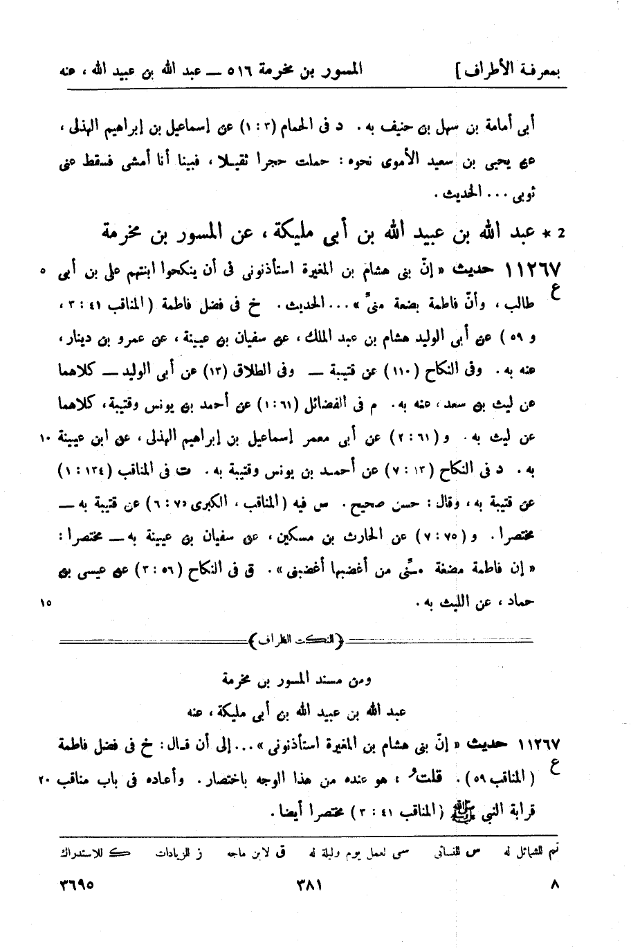11267 -[ع] حديث إنّ بني هشام بن المغيرة استأذنوني في أن ينكحوا ابنتهم علي بن أبي طالب، وأنّ فاطمة بضعة منِّي ... الحديث. خ في فضل فاطمة (المناقب 41: 3 و59) عن أبي الوليد هشام بن عبد الملك، عن سفيان بن عيينة، عن عمرو بن دينار , عنه به. وفي النكاح (110) عن قتيبة - وفي الطلاق (13) عن أبي الوليد - كلاهما عن ليث بن سعد , عنه به. م في الفضائل (61: 1) عن أحمد بن يونس وقتيبة، كلاهما عن ليث به. و (61: 2) عن أبي معمر إسماعيل بن إبراهيم الهذلي، عن ابن عيينة به. د في النكاح (13: 7) عن أحمد بن يونس وقتيبة به. ت في المناقب (134: 1) عن قتيبة به، وقال: حسن صحيح. س فيه (المناقب، الكبرى 75: 6) عن قتيبة به - مختصراً. و (75: 7) عن الحارث بن مسكين، عن سفيان بن عيينة به - مختصراً: إن فاطمة مضغة منِّي من أغضبها أغضبني. ق في النكاح (56: 3) عن عيسى بن حماد، عن الليث به.