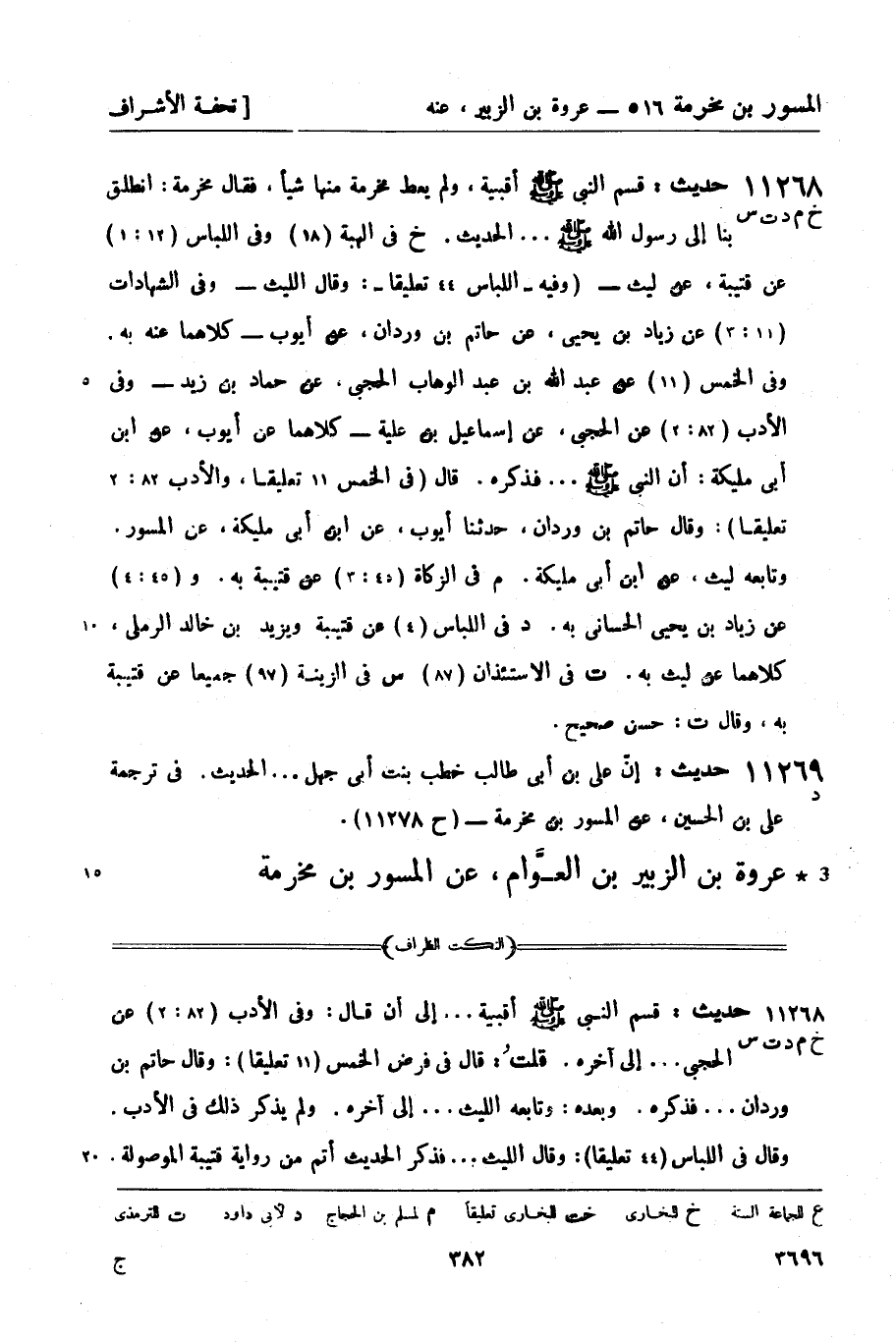 11268 -[خ م د ت س] حديث: قسم النبيّ صَلَّى اللَّهُ عَلَيْهِ وَسَلَّمَ أقبية، ولم يعط مخرمة منها شيئا، فقال مخرمة: انطلق بنا إلى رسول الله صَلَّى اللَّهُ عَلَيْهِ وَسَلَّمَ ... الحديث. خ في الهبة (18) وفي اللباس (12: 1) عن قتيبة، عن ليث - (وفيه - اللباس 44 تعليقاً -: وقال الليث - وفي الشهادات (11: 3) عن زيادة بن يحيى، عن حاتم بن وردان، عن أيوب - كلاهما عنه به. وفي الخمس (11) عن عبد الله بن عبد الوهاب الحجبي، عن حماد بن زيد - وفي الأدب (82: 2) عن الحجبي، عن إسماعيل ابن علية - كلاهما عن أيوب، عن ابن أبي مليكة: أن النبيّ صَلَّى اللَّهُ عَلَيْهِ وَسَلَّمَ ... فذكره قال (في الخمس 11 تعليقاً، والأدب 82: 2 تعليقاً) : وقال حاتم بن وردان، حدثنا أيوب، عن ابن أبي مليكة، عن المسور. وتابعه ليث، عن أن أبي مليكة. م في الزكاة (45: 3) عن قتيبة به. و (45: 4) عن زياد بن يحيى الحساني به. د في اللباس (4) عن قتيبة ويزيد بن خالد الرملي كلاهما عن ليث به. ت في الاستئذان (87) س في الزينة (97) جميعاً عن قتيبة به، وقال ت: حسن صحيح.