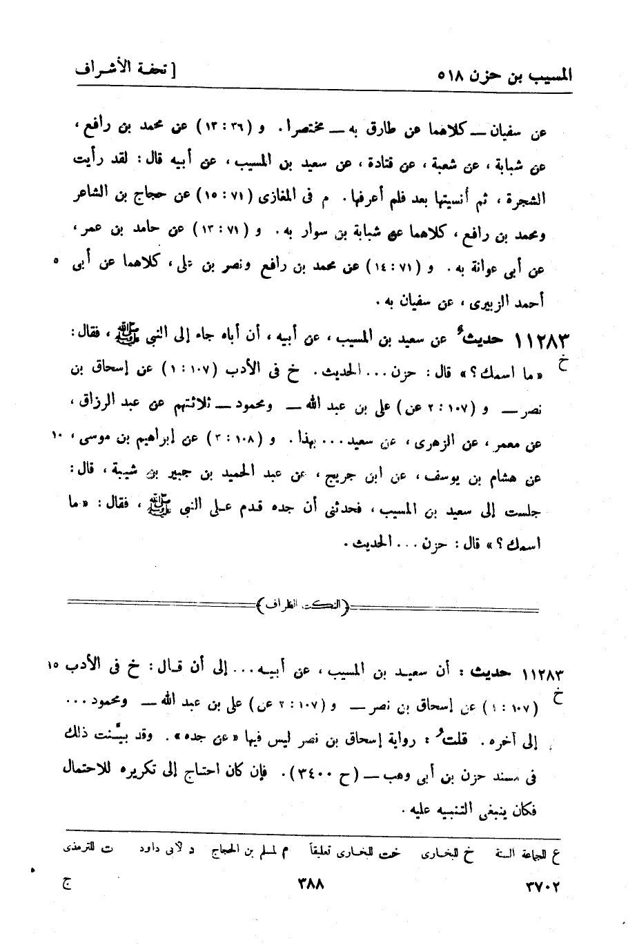 11283 -[خ] حديثٌ عن سعيد بن المسيب، عن أبيه، أن أباه جاء إلى النبيّ صَلَّى اللَّهُ عَلَيْهِ وَسَلَّمَ، فقال: ما اسمك؟ قال: حزن ... الحديث. خ في الأدب (107: 1) عن إسحاق بن نصر - و (107: 2 عن) علي بن عبد الله - ومحمود - ثلاثتهم عن عبد الرزاق، عن معمر، عن الزهري، عن سعيد ... بهذا. و (108: 3) عن إبراهيم بن موسى، عن هشام بن يوسف، عن ابن جريج، عن عبد الحميد بن جبير بن شيبة، قال: جلست إلى سعيد بن المسيب، فحدثني أن جده قدم على النبيّ صَلَّى اللَّهُ عَلَيْهِ وَسَلَّمَ، فقال: ما اسمك؟ قال: حزن ... الحديث.