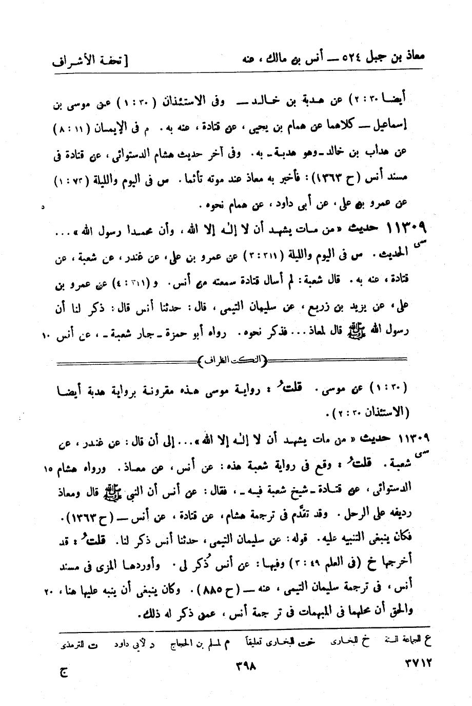 11309 -[سي] حديث من مات يشهد أن لا إله إلا الله، وأن محمداً رسول الله ... الحديث. س في اليوم والليلة (311: 3) عن عمرو بن علي، عن غندر، عن شعبة، عن قتادة , عنه به. قال شعبة: لم أسأل قتادة سمعته من أنس. و (311: 4) عن عمرو بن علي، عن يزيد بن زريع، عن سليمان التيمي، قال: حدثنا أنس قال: ذكر لنا أن رسول الله صَلَّى اللَّهُ عَلَيْهِ وَسَلَّمَ قال لمعاذ ... فذكر نحوه. رواه أبو حمزة - جار شعبة -، عن أنس -[399]- عن النبيّ صَلَّى اللَّهُ عَلَيْهِ وَسَلَّمَ - ولم يذكر معاذاً في إسناده، وقد مضى - (ح 984) .