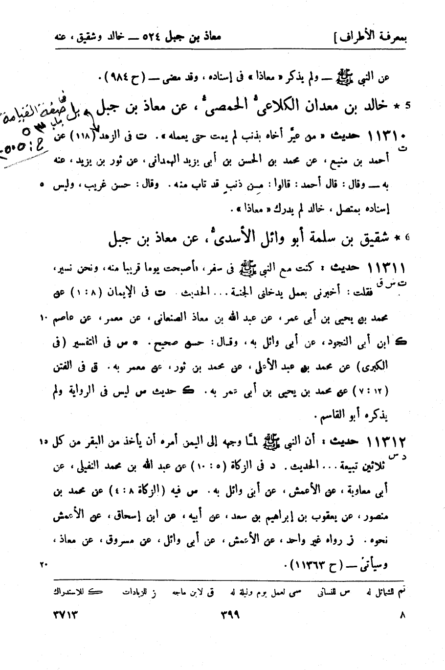 11311 -[ت س ق] حديث: كنت مع النبيّ صَلَّى اللَّهُ عَلَيْهِ وَسَلَّمَ في سفر، فأصبحت يوماً قريباً منه، ونحن نسير، فقلت: أخبرني بعمل يدخلني الجنة.... الحديث. ت في الإيمان (8: 1) عن محمد بن يحيى بن أبي عمر، عن عبد الله بن معاذ الصنعاني، عن معمر، عن عاصم بن أبي النجود، عن أبي وائل به، وقال: حسن صحيح. (ك) س في التفسير (في الكبرى) عن محمد بن عبد الأعلى، عن محمد بن ثور، عن معمر به. ق في الفتن (12: 7) عن محمد بن يحيى بن أبي عمر به. ك حديث س ليس في الرواية ولم يذكره أبو القاسم.