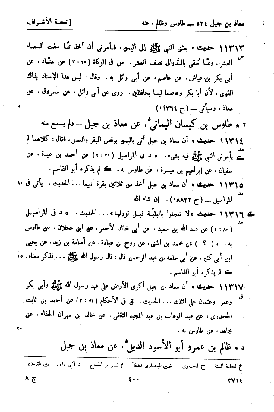 11315 - (مد) حديث: أن معاذ بن جبل أخذ من ثلاثين بقرة تبيعاً ... الحديث. يأتي في المراسيل - (ح 18832) - إن شاء الله.