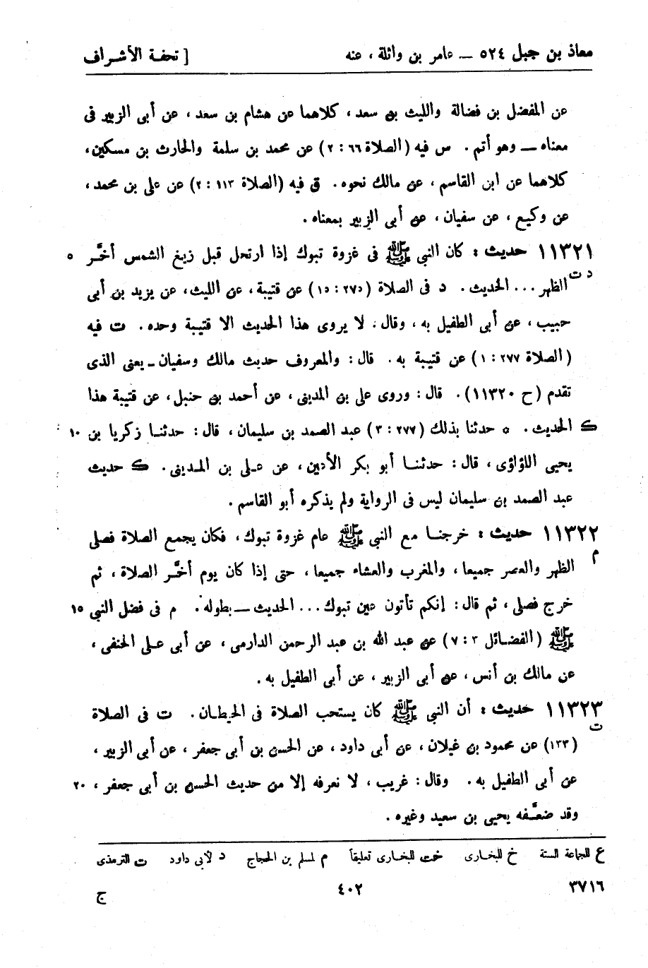 11321 -[د ت] حديث: كان النبيّ صَلَّى اللَّهُ عَلَيْهِ وَسَلَّمَ في غزوة تبوك إذا ارتحل قبل زيغ الشمس أخَّر الظهر ... الحديث. د في الصلاة (275: 15) عن قتيبة، عن الليث، عن يزيد بن أبي حبيب، عن أبي الطفيل به، وقال: لا يروى هذا الحديث إلا قتيبة وحده. ت فيه (الصلاة 277: 1) عن قتيبة به. قال: والمعروف حديث مالك وسفيان - يعني الذي تقدم (ح 11320) . قال: وروى علي بن المديني، عن أحمد بن حنبل، عن قتيبة هذا الحديث. (ك) حدثنا بذلك (277: 3) عبد الصمد بن سليمان، قال: حدثنا زكريا بن يحيى اللؤلؤي، قال: حدثنا أبو بكر الأعين، عن علي بن المديني. ك حديث عبد الصمد بن سليمان ليس في الرواية ولم يذكره أبو القاسم.