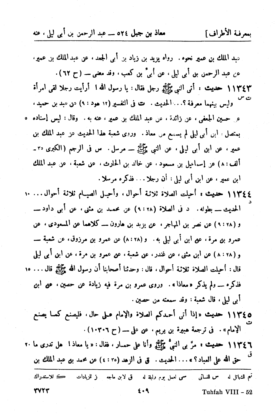 11343 -[ت س] حديث: أتى النبيّ صَلَّى اللَّهُ عَلَيْهِ وَسَلَّمَ رجل فقال: يا رسول الله! أرأيت رجلاً لقى امرأة وليس بينهما معرفة؟ ... الحديث. ت في التفسير (12 هود: 9) عن عبد بن حميد، عن حسين الجعفي، عن زائدة، عن عبد الملك بن عمير , عنه به. وقال: ليس إسناده بمتصل، ابن أبي ليلى لم يسمع من معاذ. وروى شعبة هذا الحديث، عن عبد الملك بن عمير، عن ابن أبي ليلى، عن النبيّ صَلَّى اللَّهُ عَلَيْهِ وَسَلَّمَ - مرسل. س في الرجم (الكبرى 35 - ألف: 8) عن إسماعيل بن مسعود، عن خالد بن الحارث، عن شعبة، عن عبد الملك بن عمير، عن ابن أبي ليلى: أن رجلاً ... فذكره مرسلاً.